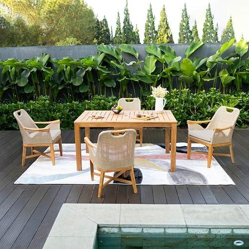 While this luxurious outdoor dining set shines in style and comfort, there are a few considerations to keep in mind. The absence of included cushions means you might need to purchase those separately for added comfort, and the set does not come with an umbrella, necessitating an additional inquiry if you require one. This furniture is constructed using glued mortise and tenon joints, promising longevity, but it requires minimal care to maintain its appearance over time as teak wood naturally weathers. this dining set signifies a fine balance of aesthetics and functionality, making it a worthy addition to your outdoor space.
