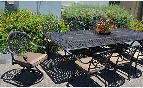 This exceptional dining set features a timeless design that combines elegance with comfort and durability. Crafted from high-quality cast aluminum, this collection is guaranteed to be rust-free, allowing you to enjoy sunny afternoons with your loved ones without any worries. The five-stage powder-coated antique bronze finish enhances both the aesthetic appeal and longevity, making it a remarkable addition to any outdoor space. The set includes two swivel rocker dining chairs and eight standard dining chairs, all of which are adorned with premium linen sesame cushions for added comfort.