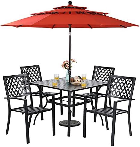 Designed for outdoor settings, this dining ensemble combines practicality and aesthetic appeal. The set includes a robust square table measuring 37″x37″, complemented by four metal chairs that boast a weight capacity of 300 lbs, making it suitable for family gatherings or intimate meals with friends. The standout feature is the 10-foot auto-tilt umbrella, crafted from durable polyester fabric and a sturdy aluminum pole, ensuring long-lasting use. It provides impressive UV protection, letting you dine comfortably under its shade. The easy crank mechanism allows for effortless opening and closing, making it perfect for spontaneous outdoor meals.