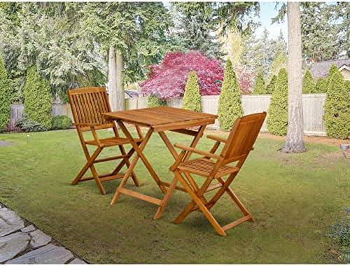 This outdoor dining set features a traditional design crafted from durable Acacia hardwood, making it ideal for garden, terrace, or porch use. The square table, measuring 25.60″ L x 25.60″ W, is supported by sturdy X-style legs and is complemented by two slatted back chairs that provide comfortable seating. The natural oil finish not only adds elegance but also offers weather resistance, allowing the set to withstand various outdoor conditions. Each chair has dimensions of 23.7″ L x 21″ W and a weight capacity of up to 300 lbs, making them suitable for a variety of users.