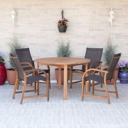 This dining set is crafted from high-quality 100% FSC certified eucalyptus wood, renowned for its stunning reddish-brown hue that deepens with age. The natural properties of eucalyptus make it a sustainable and durable choice, offering exceptional resistance to rot and decay, making it perfect for outdoor settings as well as graceful for indoor display. With a seating capacity of four, the round table is complemented by four attractive armchairs, all designed for comfort and style. The set includes a range of dimensions that cater to families or small gatherings, and its stackable chairs facilitate easy storage.