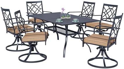 This stunning outdoor dining setup combines a spacious rectangular metal slatted table with six comfortable swivel chairs, ideal for family gatherings or entertaining friends. The table features an umbrella hole, allowing you to create a shaded eating area, making it a perfect addition to patios, gardens, or backyards. The elegant design, complemented by soft cushions and a durable E-coating metal frame, ensures both style and functionality. Swivel chairs provide a delightful seating experience, enabling easy movement without the hassle of getting up.