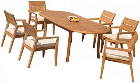 Crafted from select kiln-dried teakwood, this outdoor dining set features a 94” double extension oval table complemented by six stacking arm chairs. The unique dual butterfly extension leaf system allows for adaptable dining configurations, making it perfect for both intimate family meals and larger gatherings. With dimensions that adjust from 71” to 94”, the table is versatile enough for any occasion. The addition of a 2” umbrella hole ensures shade on sunny days, and when not in use, a wooden cap elegantly covers the hole. The stainless steel accents enhance its aesthetic appeal while ensuring durability against the elements.
