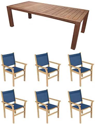 This exceptional outdoor furniture set elevates any dining experience with its exquisite craftsmanship and elegant design. The rectangular table, measuring 96 inches, is made from premium plantation-harvested teak wood, known for its exceptional durability and natural resistance to the elements. The high oil content in the wood ensures longevity and minimal maintenance, making it ideal for outdoor settings. Additionally, the table design includes a 2-inch umbrella hole, perfect for providing shade during hot summer days. Complemented by six Captiva Chairs, which also feature vibrant navy sling seating, this dining set provides a comfortable and stylish environment for family dinners or entertaining guests.