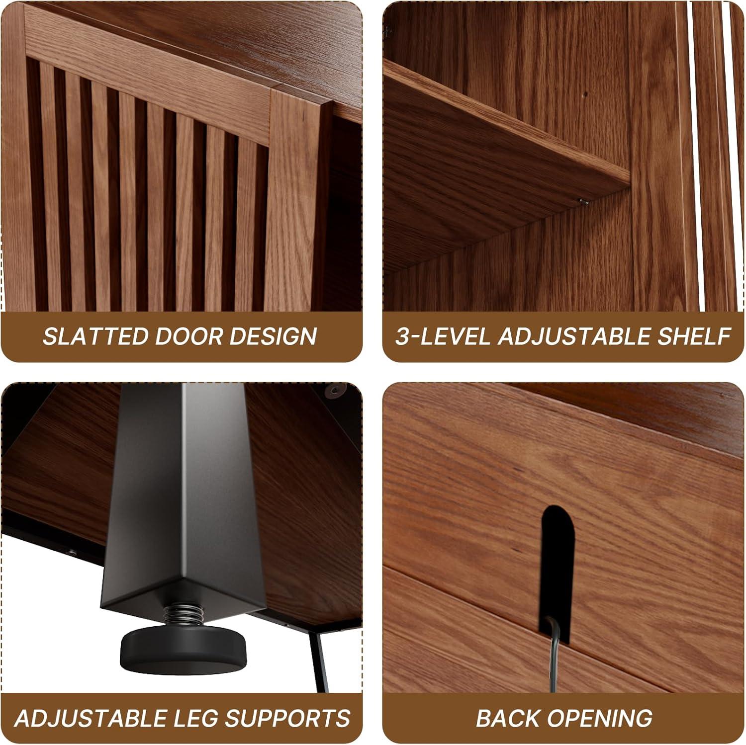 On a day-to-day basis you interact with the shelves and cable openings as part of ordinary living-room chores: sliding the doors aside to grab a game case, angling a shelf up half an inch to fit a streaming box, or tugging a power cord through the rear opening when you swap a router. Cables tend to collect behind the console, so the small ritual of coaxing a loop through the access point and tucking the rest under the shelf becomes part of changing inputs or charging devices.Little habits emerge — leaving a short length of slack for the next time you pull a player out, nudging the shelf lip forward to reach a USB port, or nudging the levelers when the floor feels uneven — and these micro-adjustments shape how often you actually move the shelves versus rearranging the items on them.