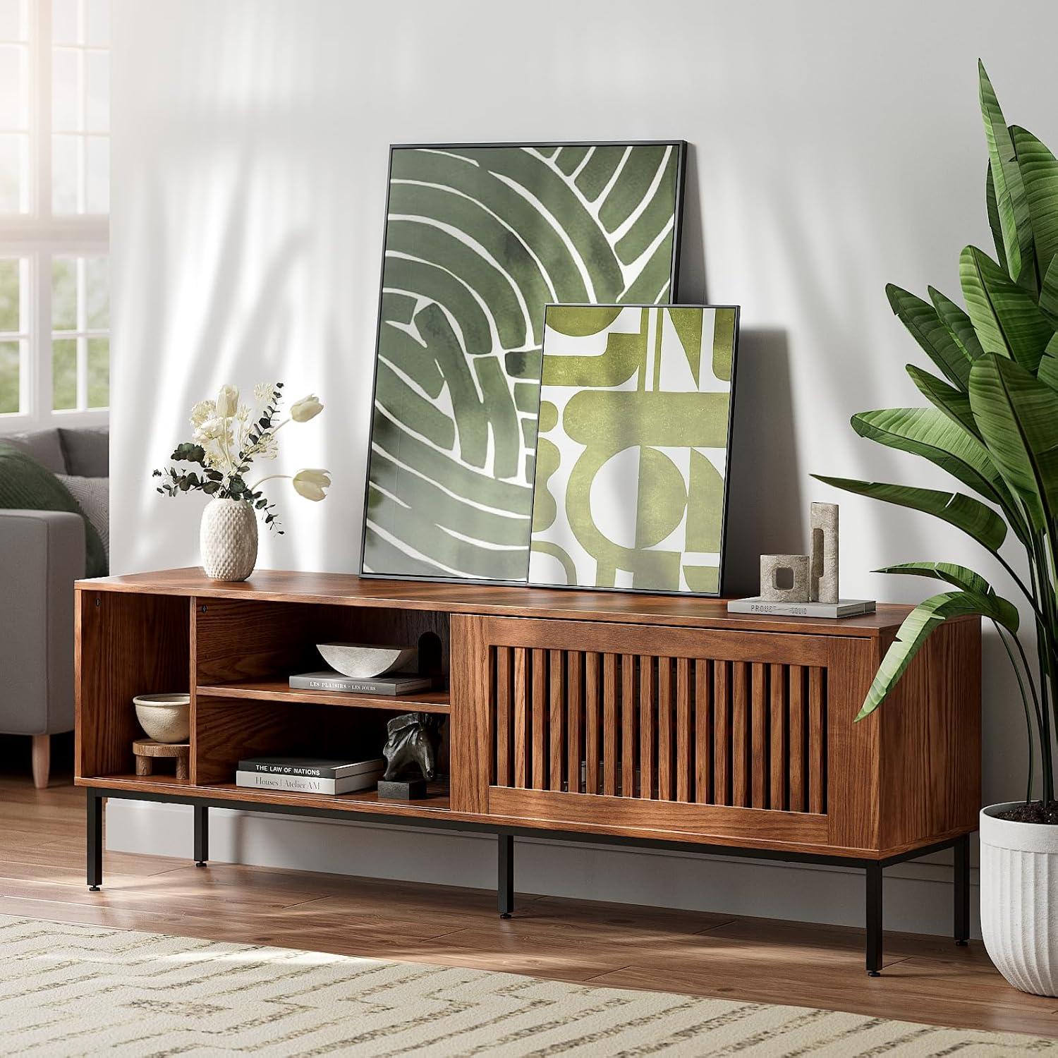 When you first set eyes on this farmhouse-style console beneath a large television, it tends to behave less like furniture and more like a stage set for whatever you place on it. The rustic brown finish and the darker metal elements create a layered silhouette that draws the eye along the wall; in practical terms, that means the piece both anchors the screen and gives you a wide horizontal plane to arrange everyday objects. The sliding doors interrupt that plane when you move them,changing what the room feels like without shifting other décor,and the raised base leaves a visible gap under the cabinet that lets the floor show through — which can make the whole corner feel airier than a solid skirted unit would.