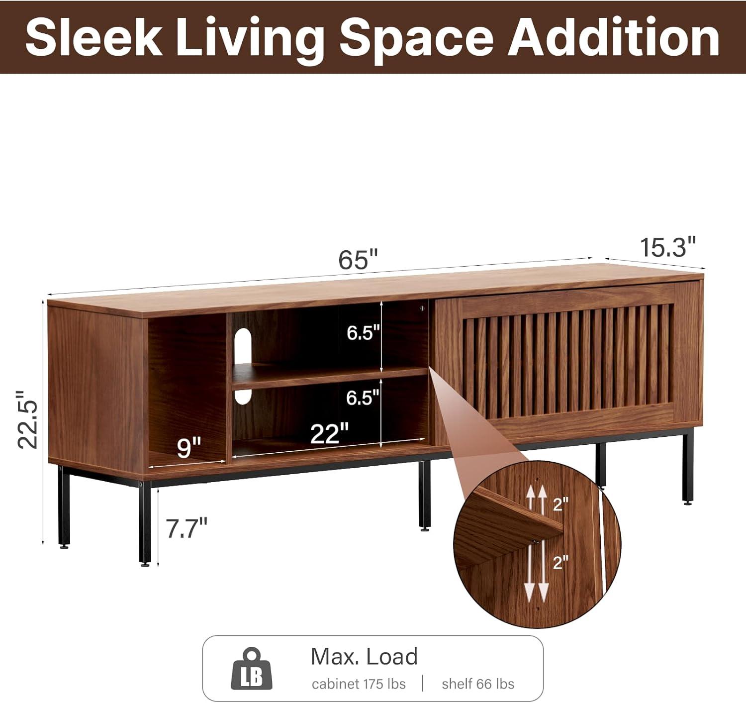 Once positioned, the console sits low and relatively flush against a wall, leaving a visible gap beneath that makes vacuuming or quick dusting easier than with a fully grounded cabinet. The metal legs and levelers keep it stable on slightly uneven surfaces, but you’ll notice tiny posture adjustments when you slide doors or pull on shelves — these are normal and usually corrected by tweaking a leveler or two. If you place it near a busy doorway or in a narrow alcove, allow a bit of forward space so the front panels and any inside drawers can be accessed without bumping into foot traffic; tight corners can make wiring and component rearrangement feel fiddly. The piece tends to anchor a TV wall visually, so factor in sightlines from seating and the walkways you use most frequently rather than onyl the center viewing position.