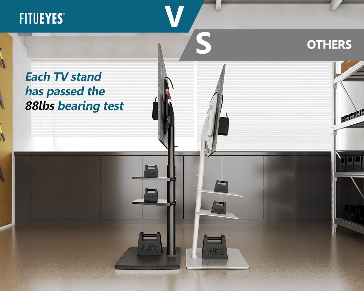 You notice it settles into daily rhythms over time, not as a new centerpiece but as something the room moves around. Living with the FITUEYES TV Floor Stand for Living Room Bedroom, tall TV Stands, the wood base and shelves quietly collect small signs of use — a faint scuff here, a ring from a cup there — and the ways you reach for the remote or lean back on the sofa adapt along with them in regular household rhythms. In the background of morning light and evening unwinding it becomes part of how space is used and how comfort behaves. It stays.