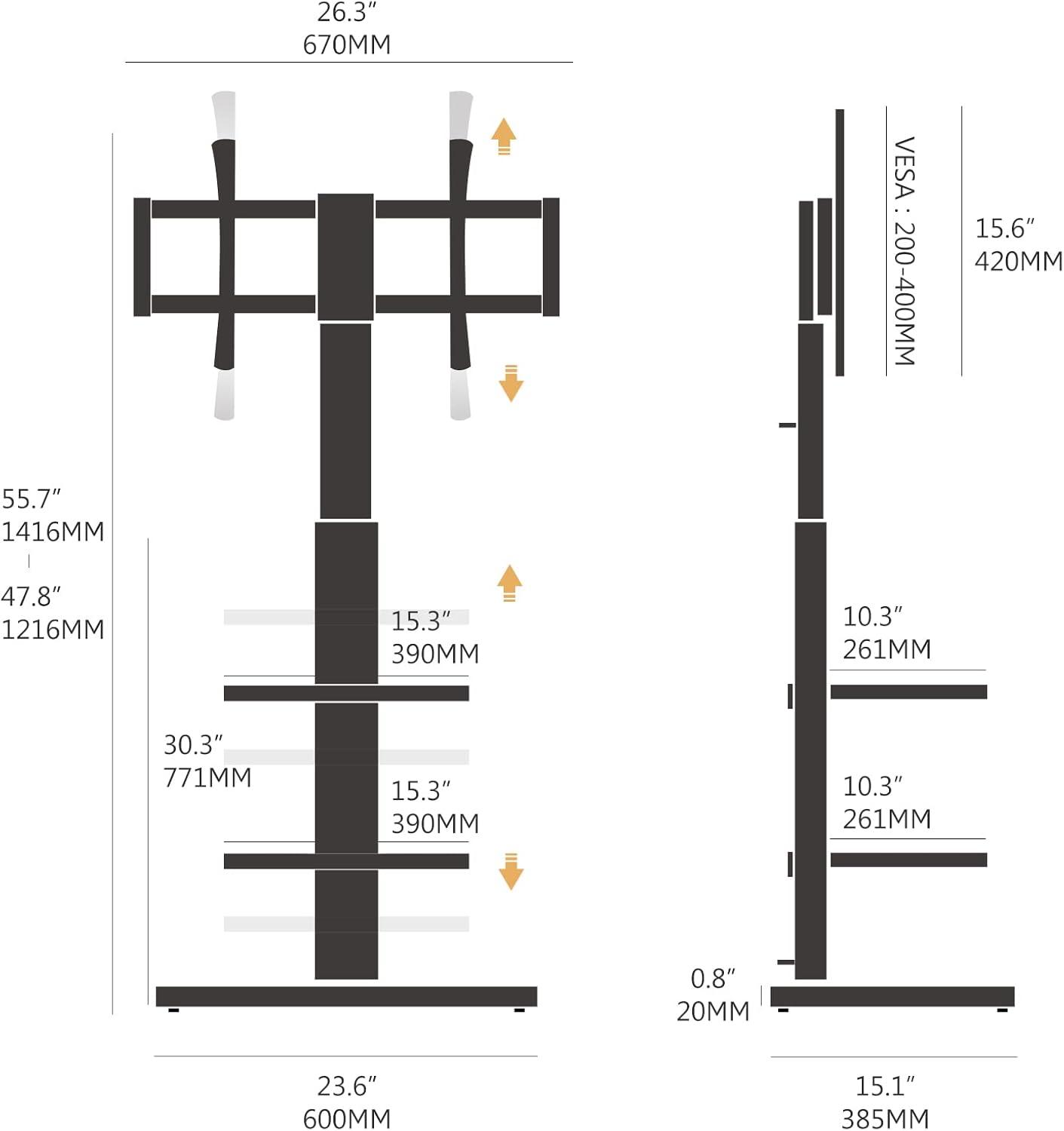 When you measure for fit, there are a handful of figures you’ll likely check on site: the bracket’s VESA compatibility, the vertical range the top of the mount can occupy, the swivel allowance, the stand’s maximum supported weight and the footprint the wood base will sit on. A rapid glance at the mounting plate will show it accepts the common hole patterns you might have written down (the mounting range covers the 200×200mm up to 600×400mm span), the mount can swivel about ±30°, and the top-of-bracket position can be set within roughly a 47.8″–55.7″ vertical window. Below are the practical numbers you’ll probably compare against your TV and room layout before you start unpacking hardware.
