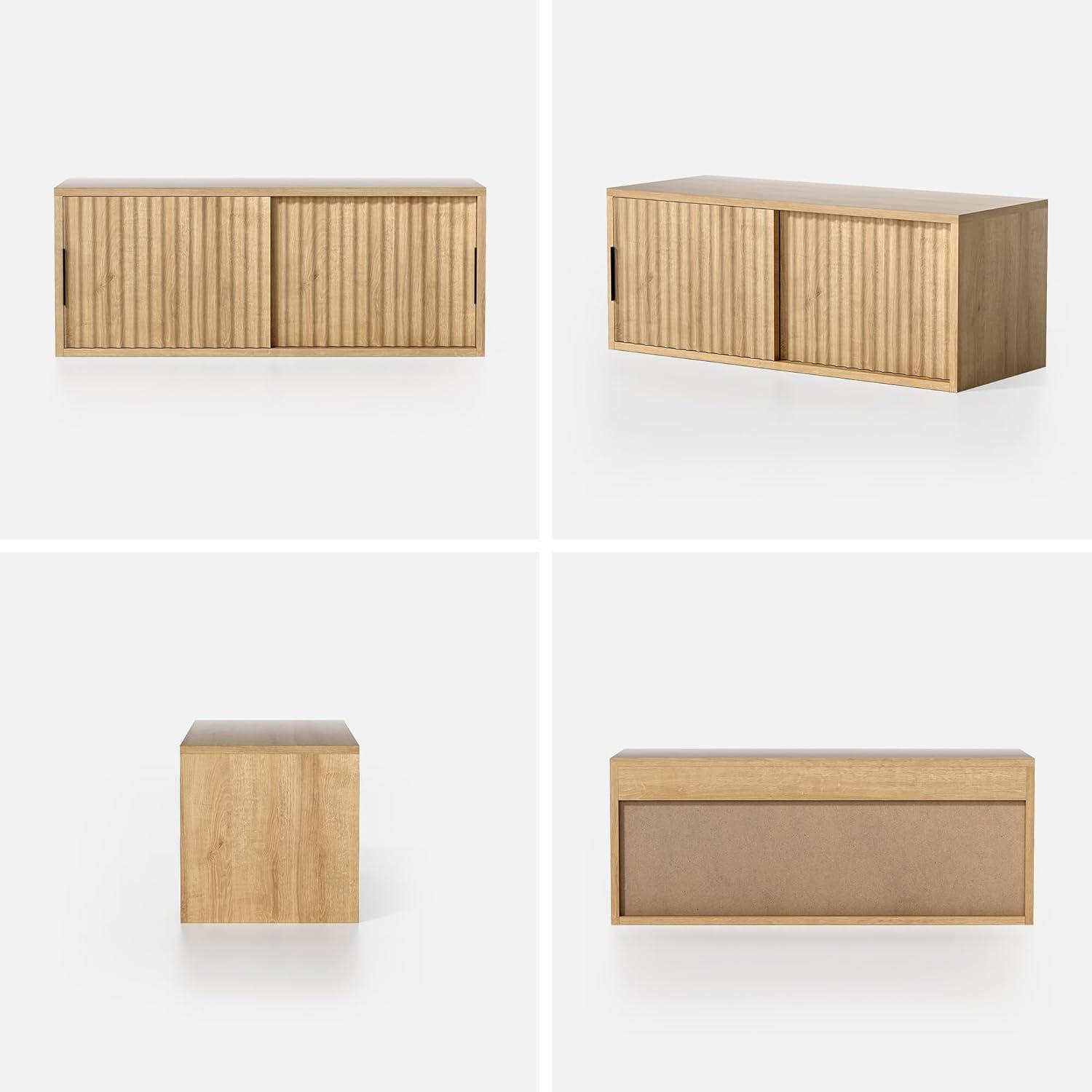 After living with the Floating TV Stands Set of 2, Modern Fluted Large Floating Nightstand Wall Mounted bedside Cabinet with Sliding Doors for Bathroom, Living Room, Bedroom, Natural Oak for a few weeks, you notice it doesn’t demand attention so much as slot into routines. In daily use the tops pick up soft scratches and the occasional mug ring, the sliding doors are eased open in passing, and the cabinets quietly hold the things you reach for in the morning and at night. It alters how the room is used — a place for a phone, a landing for a hand — and those small accommodations fold into habit. Over time it stays, simply part of the room.