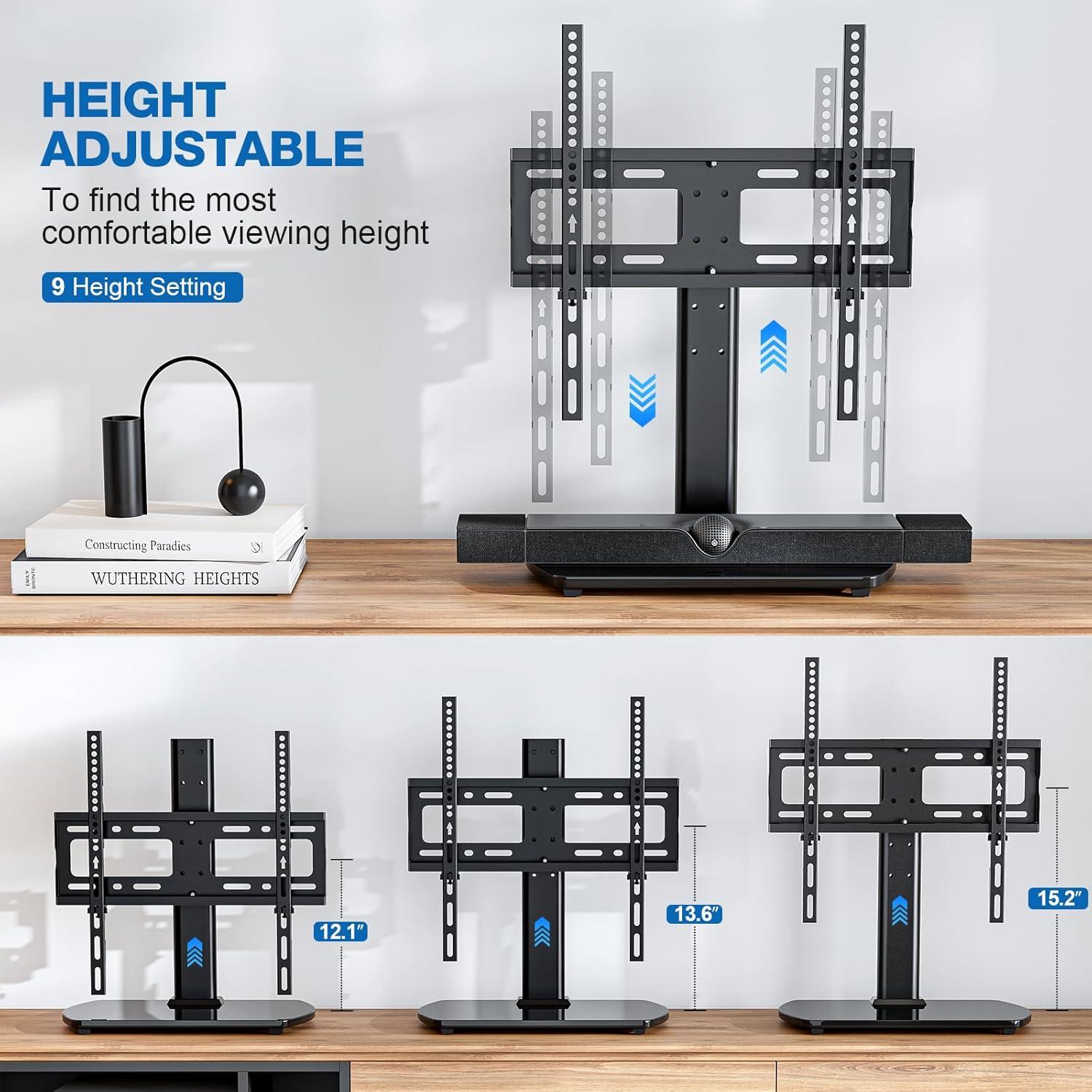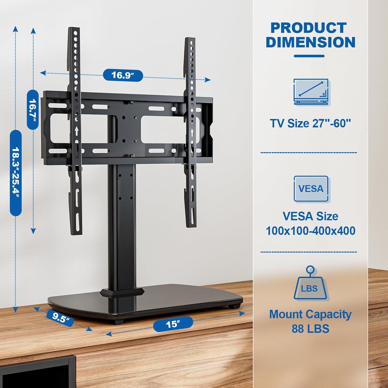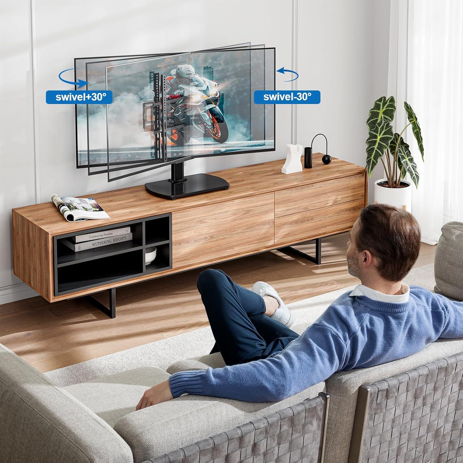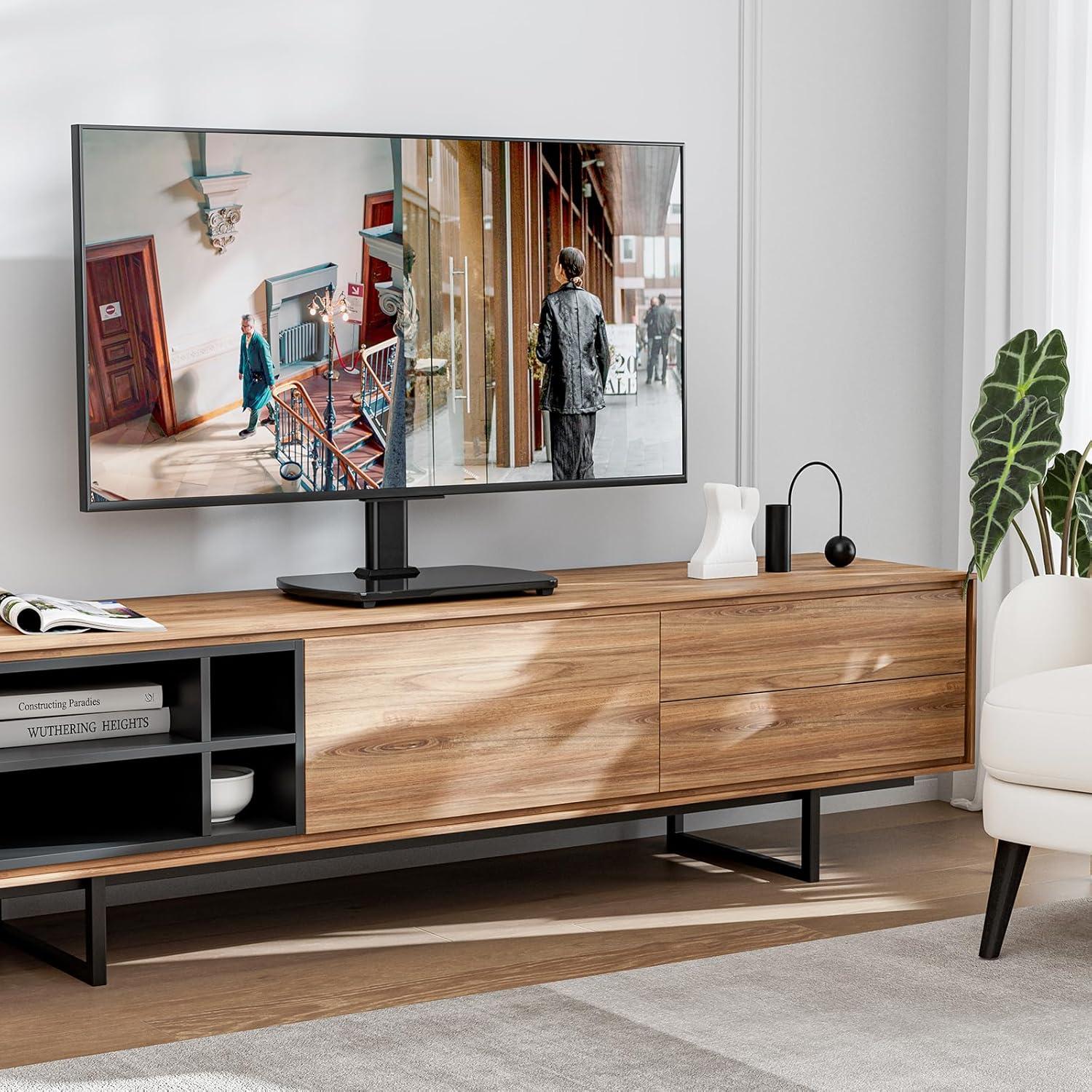 Over time you find the Universal TV Stand for 27-60 Inch TVs with Swivel Mount, Height Adjustable Table Top TV Stand Mount, Heavy duty Tempered Glass Base, TV Pedestal Stand Holds up to 88 lbs, VESA 400x400mm settling into a quiet, everyday presence where the screen usually sits.As the room is used it influences where you arrange cushions and how you move through the space; its surfaces pick up faint smudges and the occasional ring from a mug, small signs of being lived with. In daily routines you turn toward it without thinking, it slips into the background of conversations and late-night scrolling, part of regular household rhythms. You notice,that it stays.