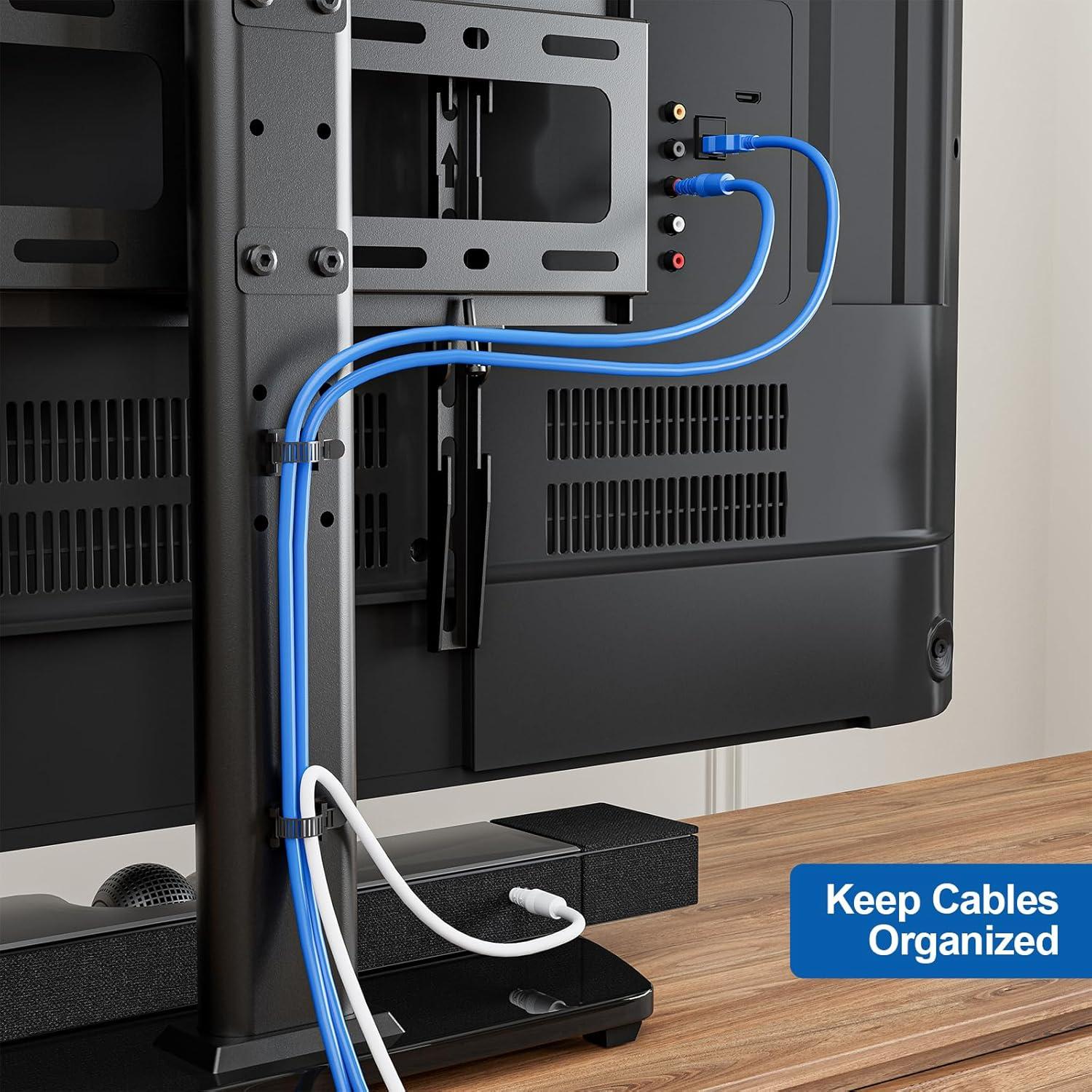 - Rear access: leave space behind the TV for cables and the pole, since the cable-management clips run up the back rather than routing through the table surface.