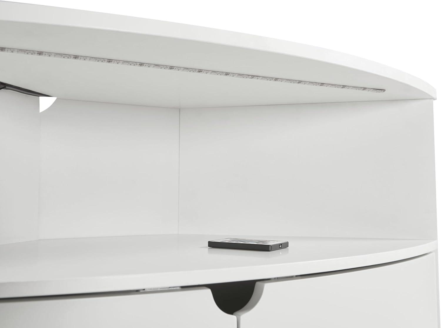 Up close, the exterior reads as a smooth, factory-applied surface rather than raw wood grain; light catches differently on the flat planes and the rounded front, giving the white finish a slightly satiny look that can show fingerprints if you brush it with your hand. Edge banding is readable where the panels meet — a thin seam follows the curve of the front and the shelf edges,and if you peer into the cabinet you can see the stacked layers of the core at cut points. The LED diffuser along the inner radius sits behind a slim translucent strip; from a few feet away the light looks continuous, but when you crouch in front of it you can make out the individual LEDs and the small remote sensor embedded near the top shelf. Inside, the door hardware and internal fixings are plainly visible: plated hinges attached with cross-head screws, simple plastic shelf pegs set into drilled holes, and a rounded cable cutout in the rear with a plain routed finish rather than a rubber grommet.A quick reference of those details is shown below.