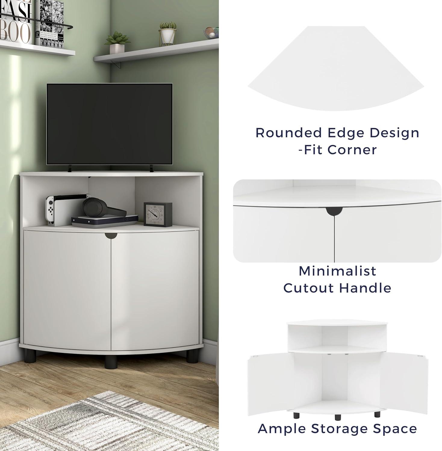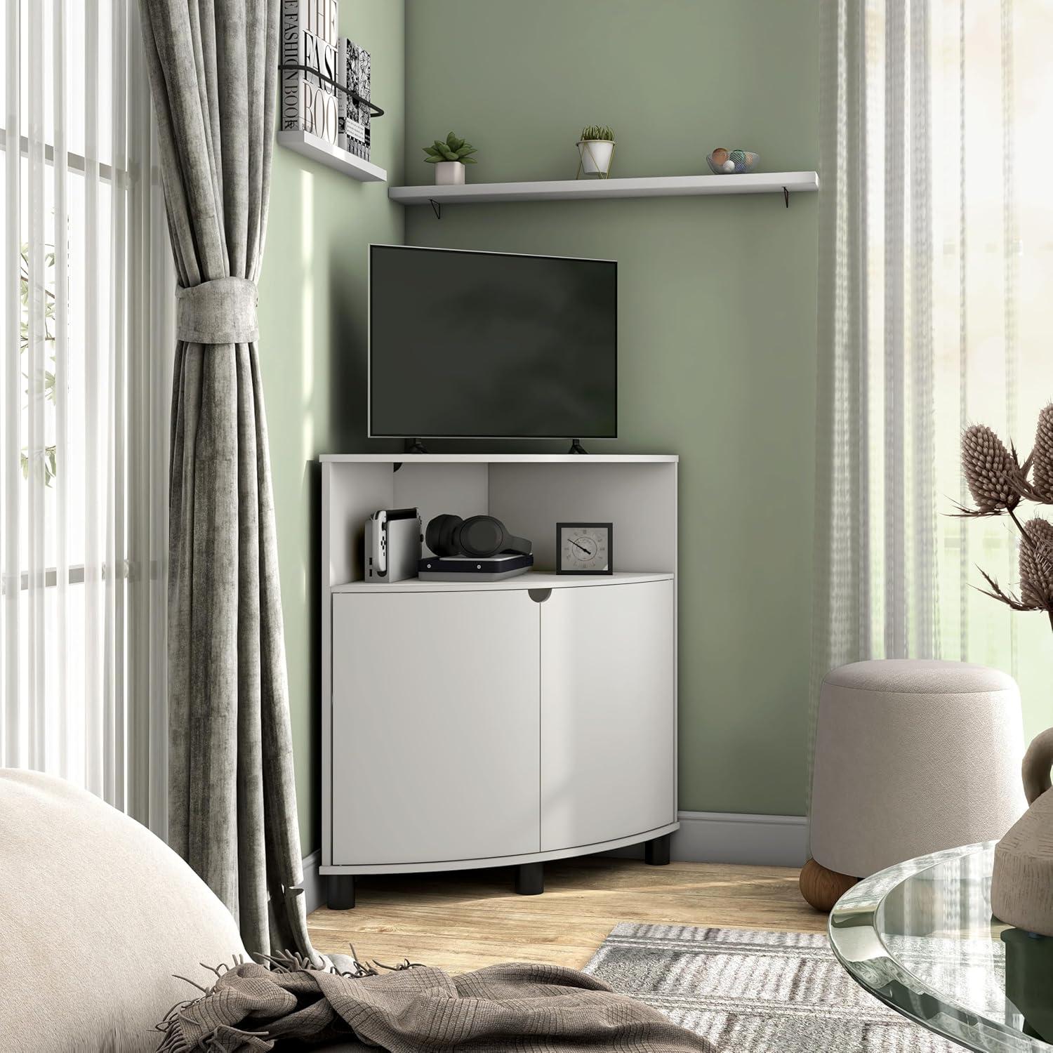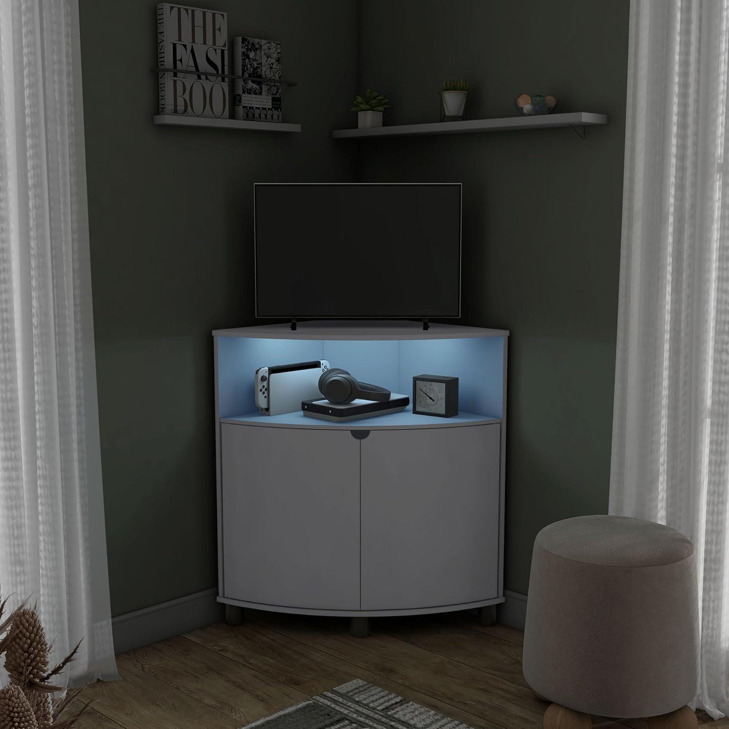 Living with the piece over time, you start to notice how it slides into corners of daily life rather than arriving with fanfare. The homes: Inside + Out Berg Modern 31-inch 16 Colors LED Corner Cabinet with Doors and 2 Shelves, USB Charge Cord, Small TV Stand for Living Room, Home Office, White quietly holds a lamp and the evening remotes, gathers the slow trades of papers and cups, and shows small scuffs that mark regular household rhythms. In daily routines it becomes somewhere you reach toward, shaping how the room is used and how movement around it feels at ease. After a while it simply rests.