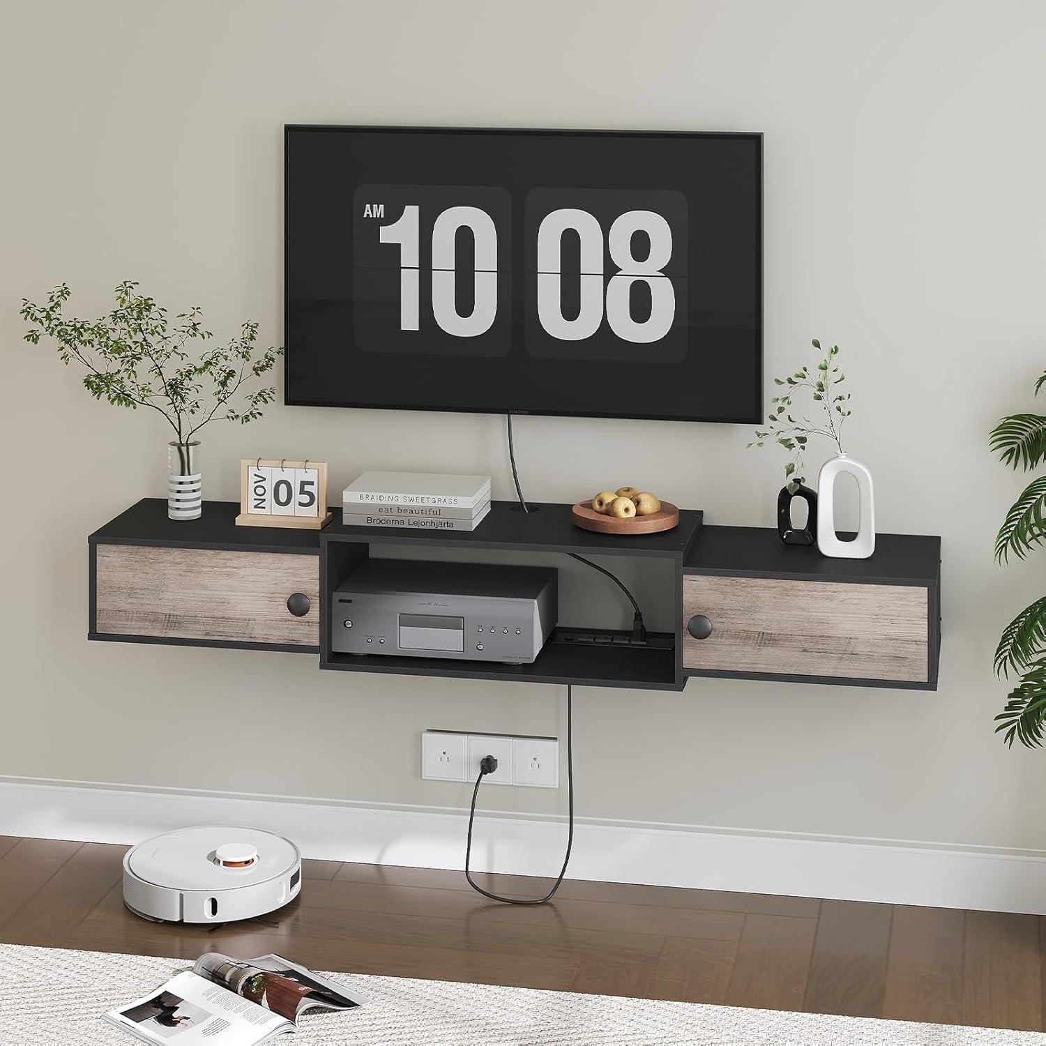 A horizontal plane seems to hover a few inches above the floor — that’s the HOOBRO 55″ Floating TV Stand with Power Outlets (BG11UDS01) in greige and black. From where you sit it reads as a low, steady presence beneath the screen, long enough to anchor the wall without shouting.Run your hand along the greige top and the finish is matte and slightly dry under the fingertips, while the black trim lends a crisp edge. When you open a side door a recessed power cluster and a tidy cubby reveal themselves, and cords slip back out of sight into a soft shadow. Scale-wise it behaves like a purposeful band across the room — considerable but not heavy — more architectural than decorative at first glance.
