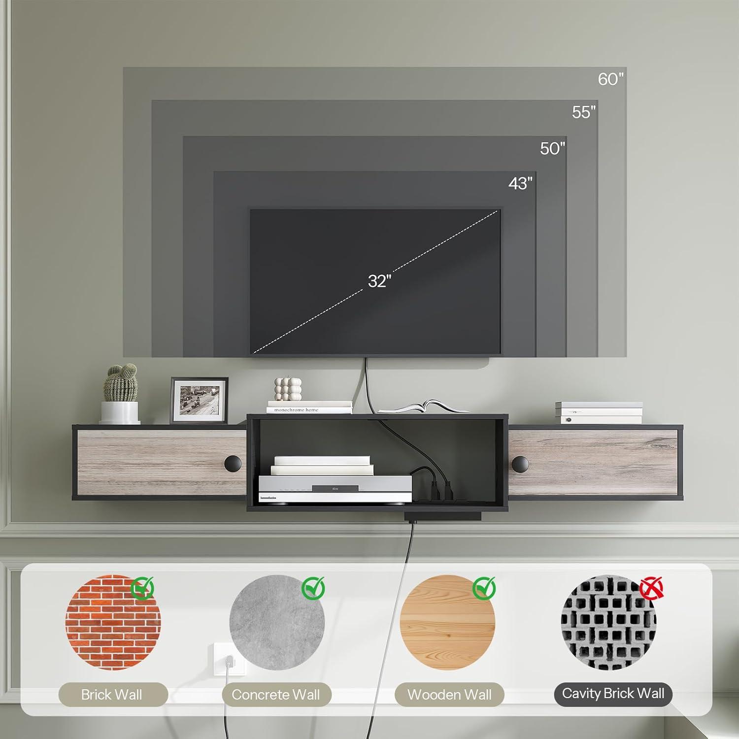 dimensionally the unit is built to sit directly beneath a mounted screen rather than act as a freestanding base; the overall width is 55″, and the shallow profile keeps the cabinet close to the wall so the TV’s lower edge and the shelf sit in near alignment rather than creating a deep step forward. in practical terms that means you’ll tuck media components into the recessed cavities and feed power through the integrated plugs without needing long runs of visible cable. The table below pulls the most directly relevant placement details together so you can picture how it will occupy the wall under your set.
