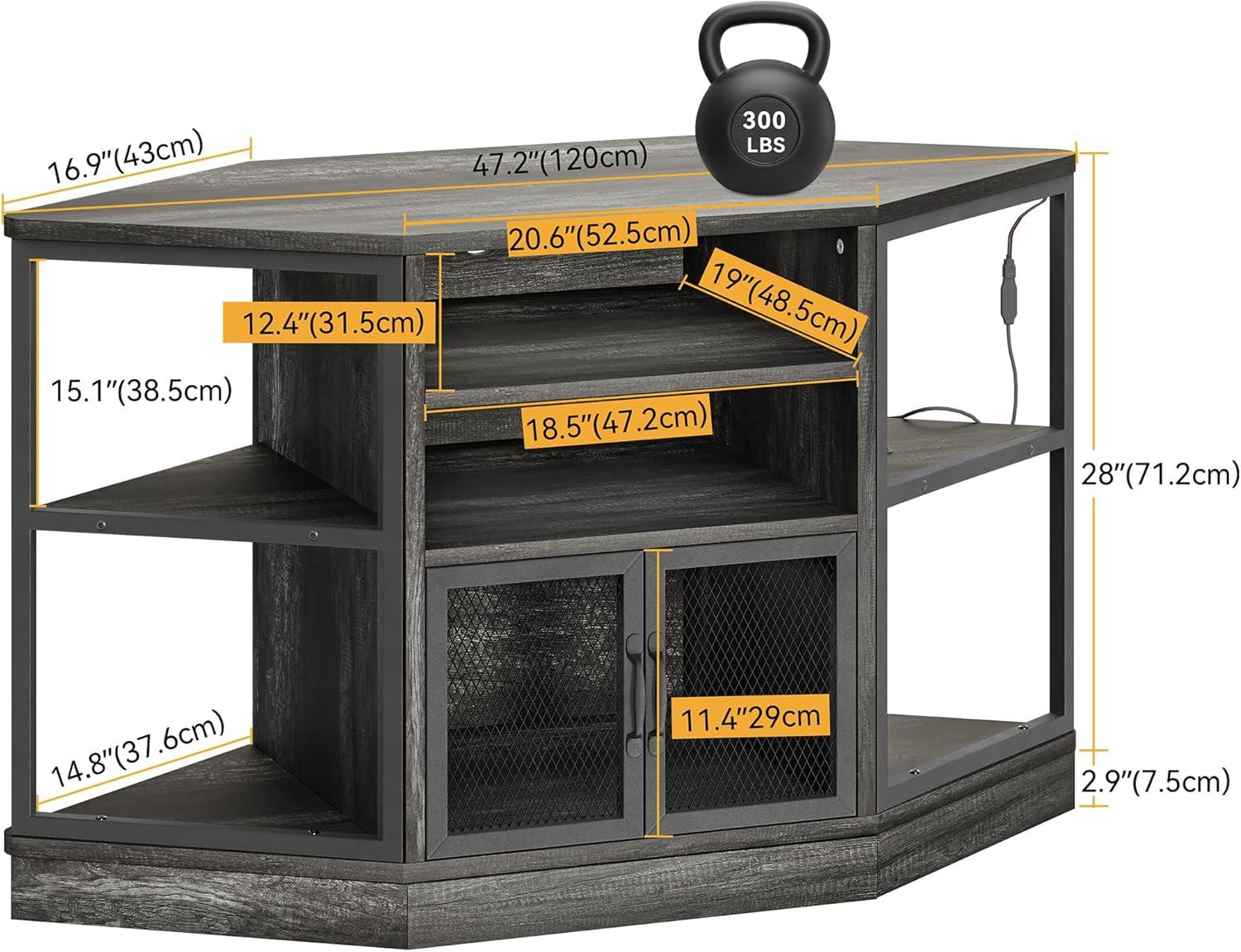 Our experience with this corner TV stand highlights its sleek and practical design, perfectly suited for modern living rooms where space optimization matters. The distinctive corner cabinet style allows it to fit snugly into unused corners, freeing up valuable floor area without sacrificing storage or display options. The grey finish adds a subtle contemporary vibe that blends effortlessly with a range of décor themes, while the blend of solid wooden panels and a robust iron frame ensures both durability and long-term stability.
