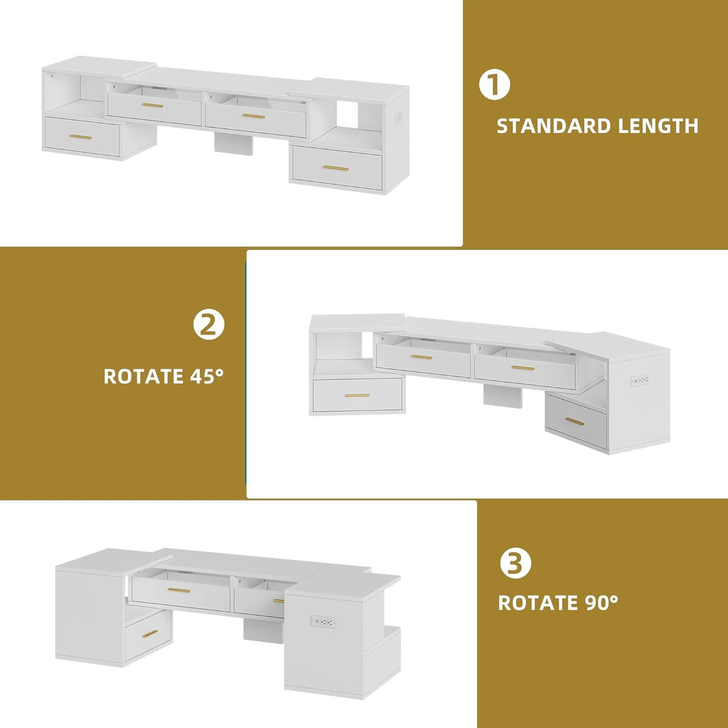 Right out of the box, this entertainment center impresses with its versatility and modern design.The unique shape-shifting capability allows it to seamlessly adapt to various room layouts-whether you prefer a long, streamlined setup, a 45° angle to snugly fit a corner, or a compact 90° formation that maximizes space. The sleek white finish coupled with acrylic accents adds a contemporary charm that effortlessly uplifts the aesthetic of our living room.Assembly was straightforward and took about 30 minutes with the provided clear instructions, making it an accessible DIY project.