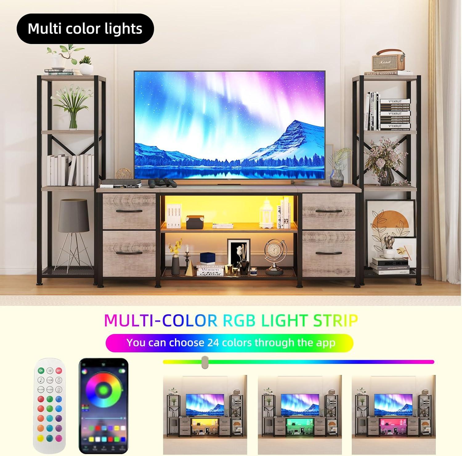 After spending time with this entertainment center, we appreciate its blend of modern design and practical functionality. The built-in LED lighting adds a unique ambiance, while the integrated charging station keeps devices powered and within reach, reducing clutter. Its sturdy metal frame and particleboard construction provide solid support for TVs up to 120 lbs. The flexible positioning of the industrial-style bookshelves offers versatility, allowing users to adapt the setup to different rooms or needs. The inclusion of four fabric drawers is a smart solution for organizing remotes, cables, and other accessories, making the entire unit a streamlined centerpiece for any living room.