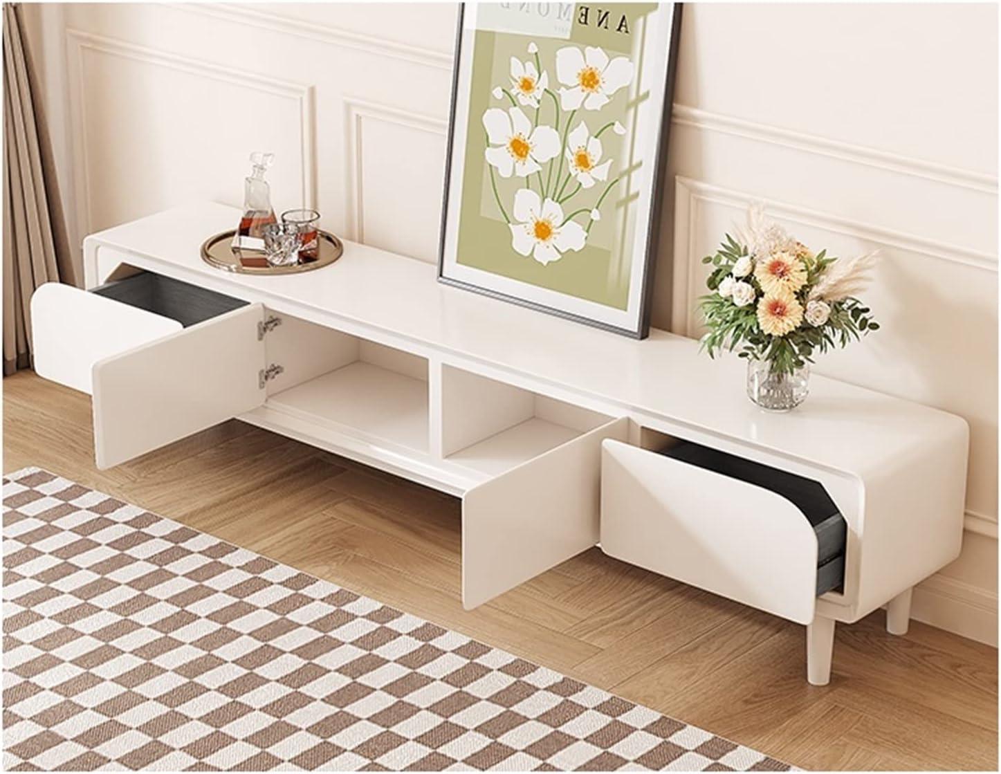 In addition to its practical benefits, the stand’s versatility has exceeded our expectations. besides serving as a TV cabinet, it works seamlessly as a coffee table or side table, which is perfect for small living rooms or entryways. We also appreciate the two large drawers that offer ample storage for books, remotes, and DVDs, protecting them from dust while keeping everything within easy reach. The combination of cream-colored materialboard gives it a refined look that complements a variety of interior styles without overwhelming the décor.