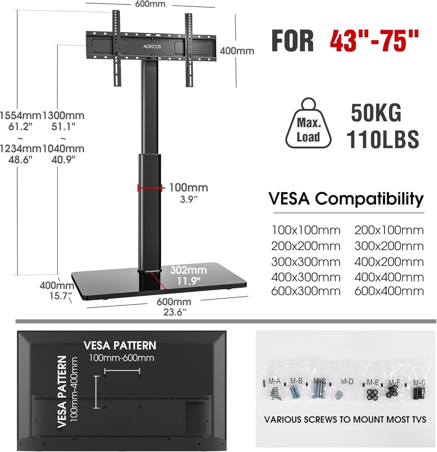 | Wide Compatibility Works with tvs sized 43″ to 75″ with a max VESA 600×400 mm – great flexibility for upgrading screens without changing the stand. |