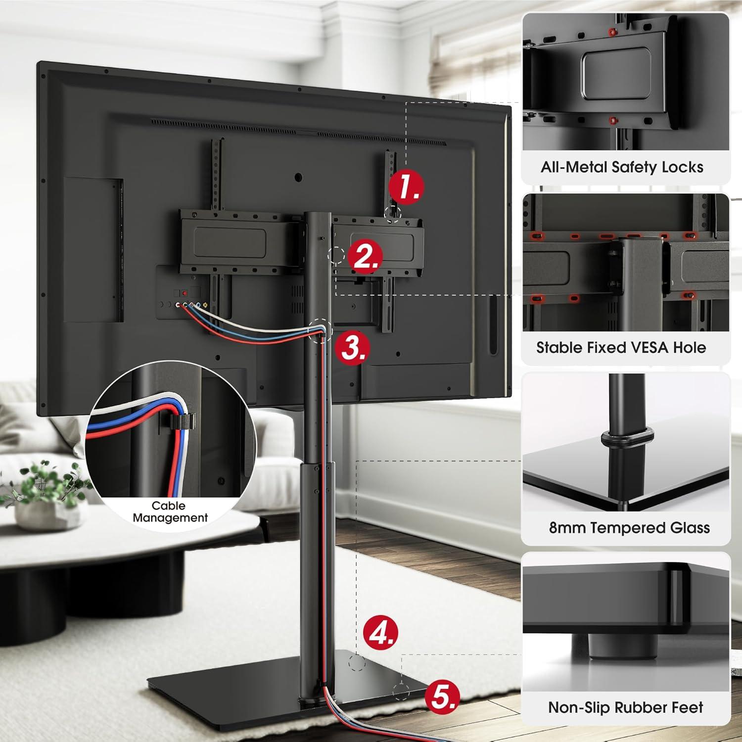 this floor stand is a smart, stylish investment for anyone looking to enhance their TV setup without drilling into walls. Its versatility and sturdy construction make it a dependable solution for varied room layouts.Ready to upgrade your viewing experience? Check it out on Amazon and bring both elegance and flexibility to your space.