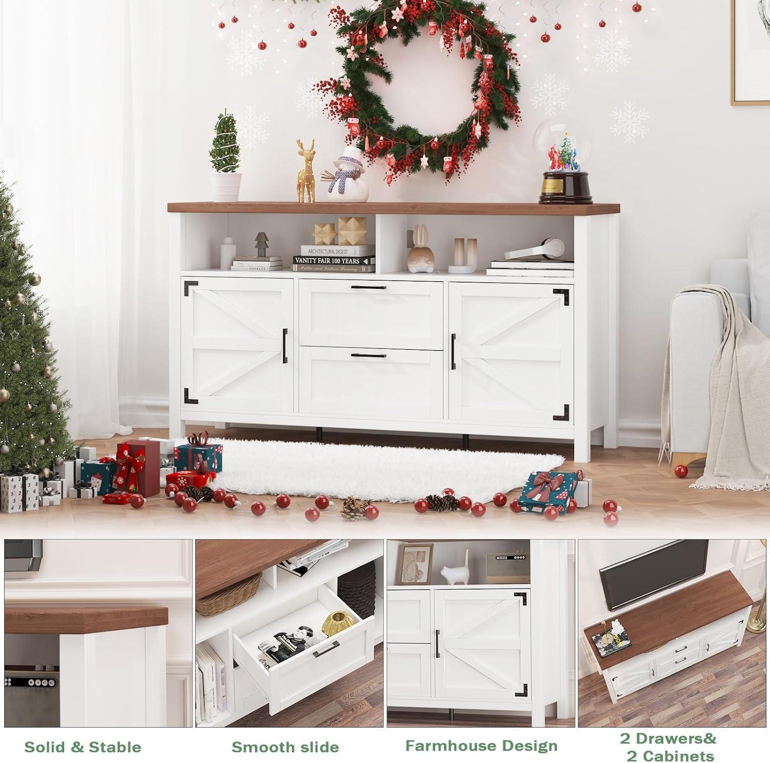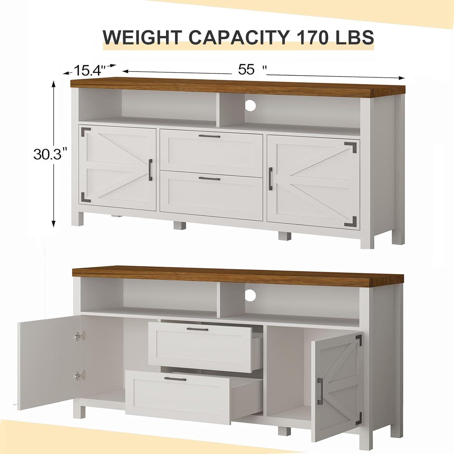 When evaluating this entertainment center for placement in the kitchen or dining area, its size and design truly stand out. Measuring 55″ in length,15.4″ in depth, and 30.3″ in height, it offers a sleek footprint that doesn’t overcrowd smaller spaces, making it ideal for both cozy kitchens and more spacious dining rooms. The classic farmhouse style-with distressed white finish and black hardware-blends effortlessly with rustic or modern country décor, enhancing the ambiance without feeling out of place.