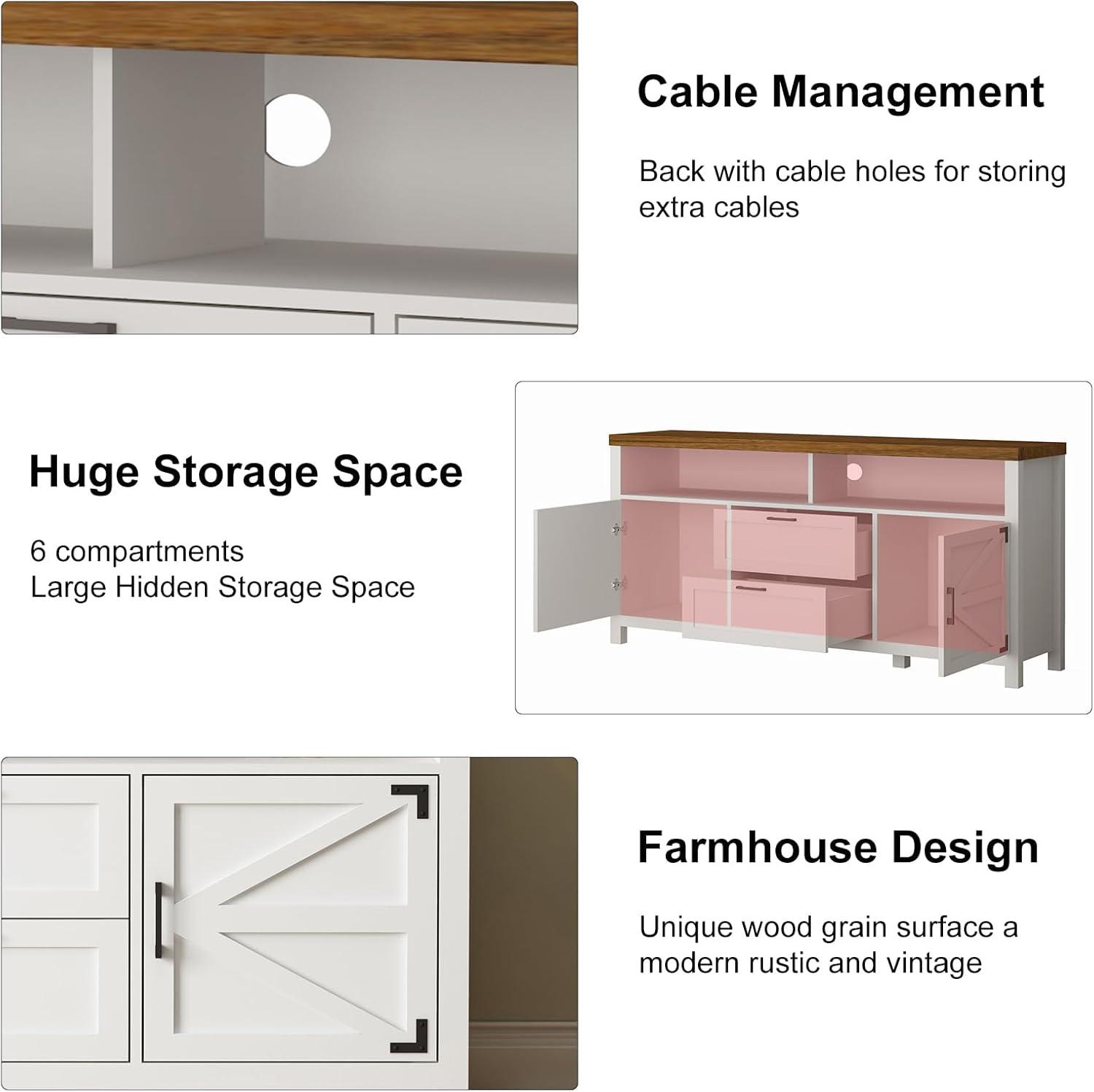 After thoroughly testing this entertainment center, we find it strikes an excellent balance between style, functionality, and durability. The classic farmhouse design paired with distressed finishes and vintage black hardware creates an inviting and timeless aesthetic that seamlessly fits a variety of room decors. It offers ample storage solutions thanks to the two large drawers and barn door cabinets, which are perfect for organizing media devices, books, and decorative items. The built-in cable management holes further enhance its practicality by keeping wires neat and out of sight,reducing clutter for a clean look.