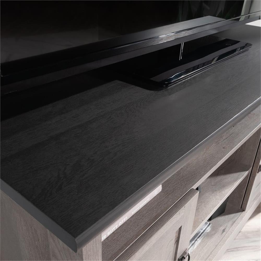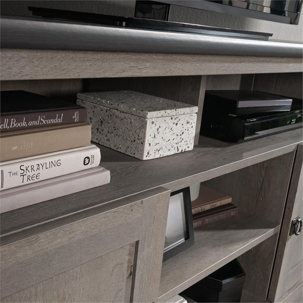 Its thoughtful corner design helps us make the most out of any room, especially where space is limited.The rich Mystic Oak finish, accented with Raven Oak on top, brings a subtle warmth and character that fits seamlessly into a variety of décor styles-from rustic farmhouse retreats to sleek contemporary living areas. With adjustable shelves tucked behind framed doors and an open center shelf, we find it easy to customize storage for everything from gaming consoles and DVDs to decorative accents and audio equipment. This adaptability ensures that it complements not just the entertainment setup, but also enhances the overall ambiance of our spaces.