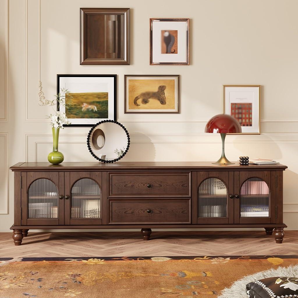 when assessing this cabinet against other TV stands we’ve used, its blend of functional storage and timeless retro aesthetics truly stands out. The rich chestnut finish paired with arched Changhong glass offers a refined look that elevates any living space, while maintaining that classic American style vibe.Unlike many modern cabinets that sacrifice style for practicality, this piece merges both effectively-providing ample storage compartments cleverly partitioned for audio-visual gear, remotes, and decorative items alike.Its size options (180cm and 200cm lengths) suit a variety of room layouts, allowing us adaptability without overpowering the space.