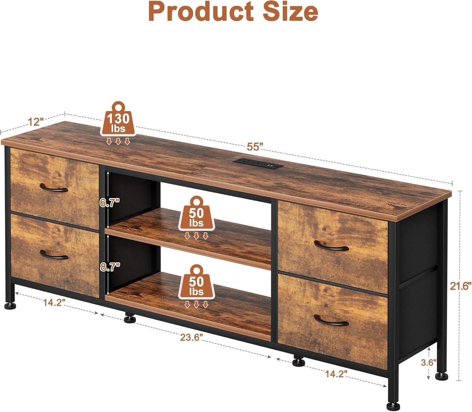 This piece effortlessly combines functionality with sleek aesthetics, making it a multi-purpose addition to any bedroom or living space. Designed to hold televisions up to 55 inches, it features two-tier open wooden shelves that provide generous room for media devices such as DVD players, gaming consoles, or decorative collectibles. The built-in power outlet with dual USB ports streamlines device charging, allowing us to keep everything powered up and organized without unsightly cords cluttering the surface.Its sturdy construction, supported by a reinforced metal frame and FSC-certified wooden tabletop, ensures reliable durability while supporting weights up to 160 lbs.