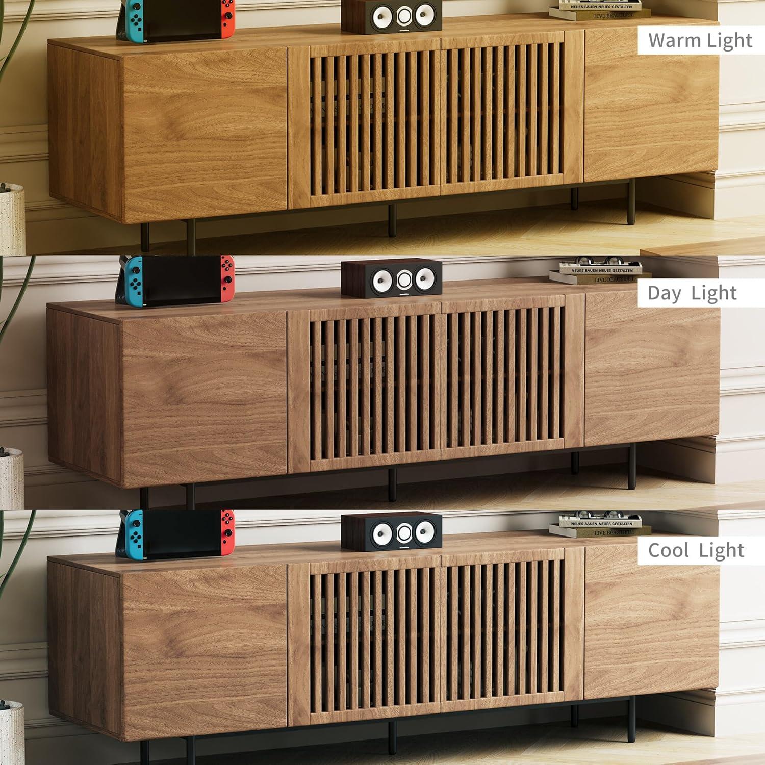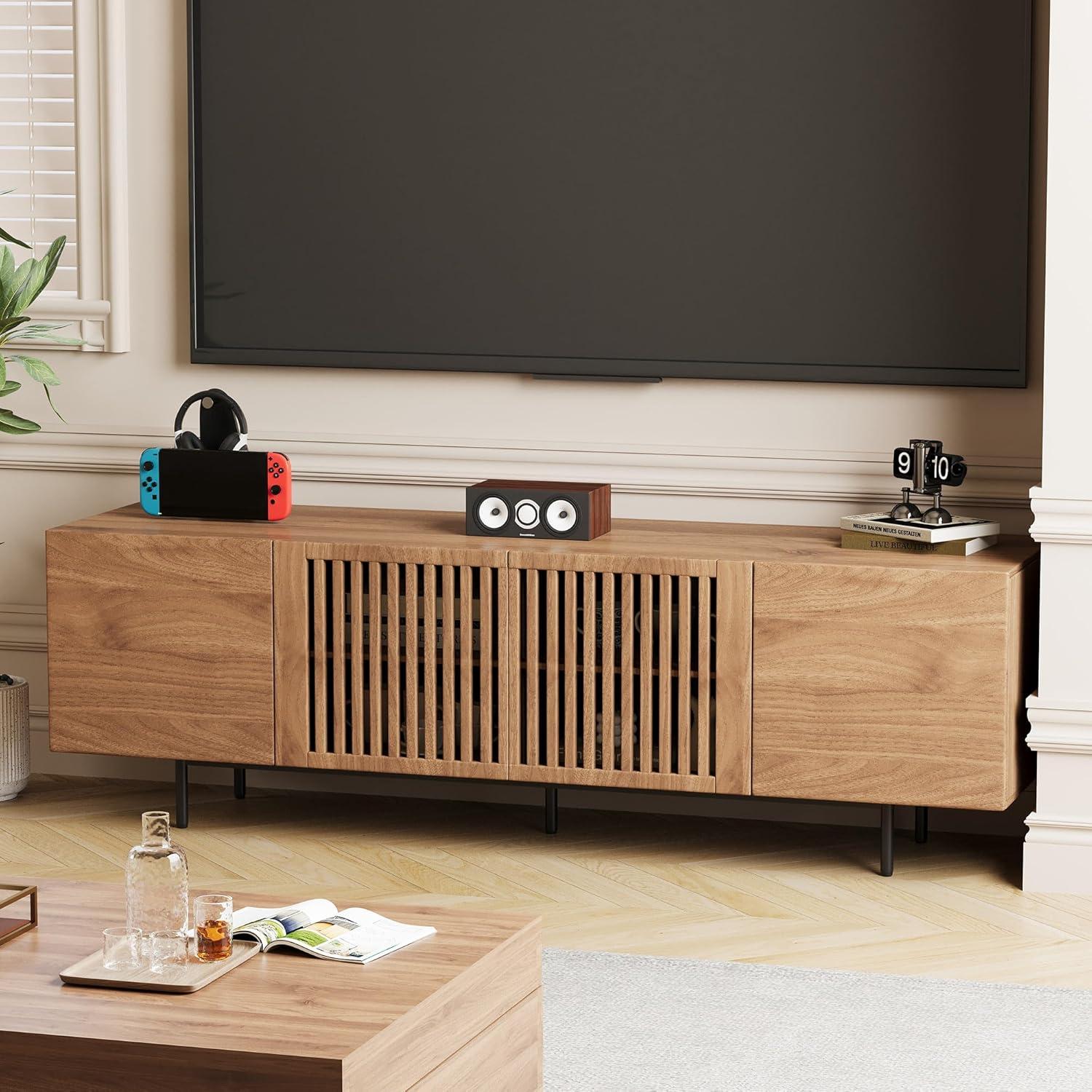 We found this entertainment center to be a perfect blend of style and function, thanks to its classic mid-century modern design and thoughtful construction. Its ability to comfortably support TVs up to 70 inches or larger, combined with the spacious surface and multiple storage compartments, makes it ideal for any living room or bedroom setup.The solid wood veneer and fiberboard construction, paired with sturdy metal framing and elegant slatted doors, guarantee both long-lasting durability and a elegant look that effortlessly elevates your space.