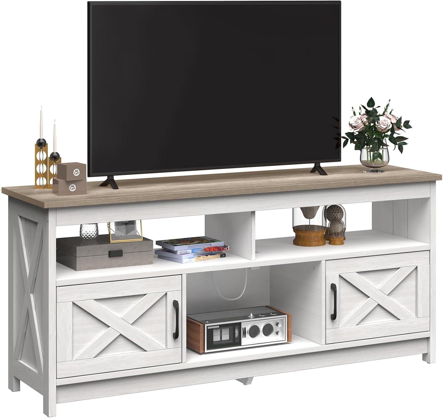 the open shelf design paired with multiple zoned compartments not only increases usability but also ensures that the structure maintains balance, even when loaded with electronics and media accessories. Thanks to the X-shaped farmhouse style on both the sides and cabinet doors, the stand doesn’t just hold weight reliably-it also adds aesthetic value without compromising sturdiness. Built-in power outlets and USB ports reduce cable clutter on the top surfaces, contributing indirectly to the stand’s overall steadiness as devices remain neatly powered without pulling on cords.