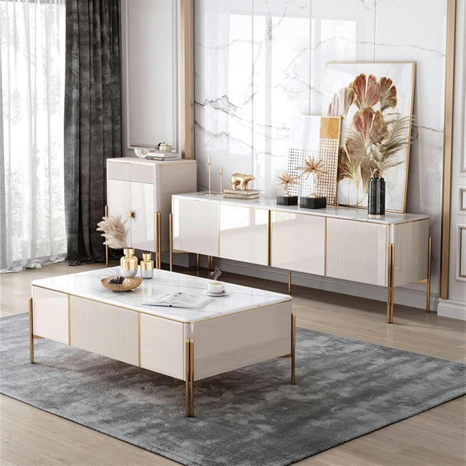 Beyond its primary function, the versatility of this piece is impressive.it seamlessly doubles as a coffee table or side table, making it a multi-purpose asset in any living room layout.Whether positioned under the television or near the seating area, it adapts to our needs with ease. This adaptability, combined with its light and luxurious style, ensures it complements the room without overwhelming it, striking a perfect balance of form and function.