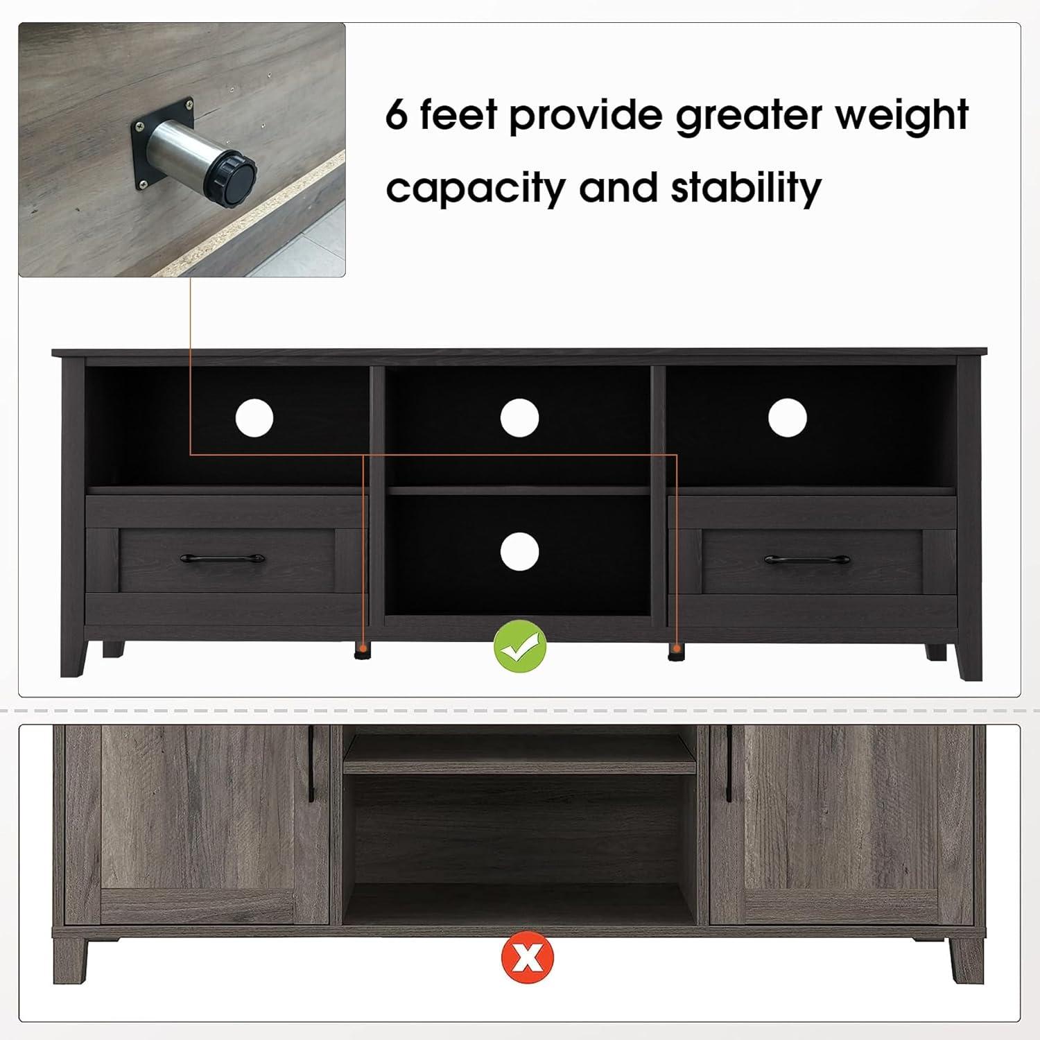 Upon examining the construction, we found that the use of thickened, high-grade certified MDF boards imbues the unit with notable sturdiness. The texture and finish offer a smooth, high-gloss surface that not only enhances the farmhouse charm but also resists minor scratches and wear over time. Additionally, the four robust legs combined with two central columns create a well-balanced foundation that prevents wobbling, ensuring the console remains stable under heavy televisions up to 80 inches. The incorporation of two anti-rewind tapes at the back is a thoughtful safety feature that adds extra assurance against accidental tipping.
