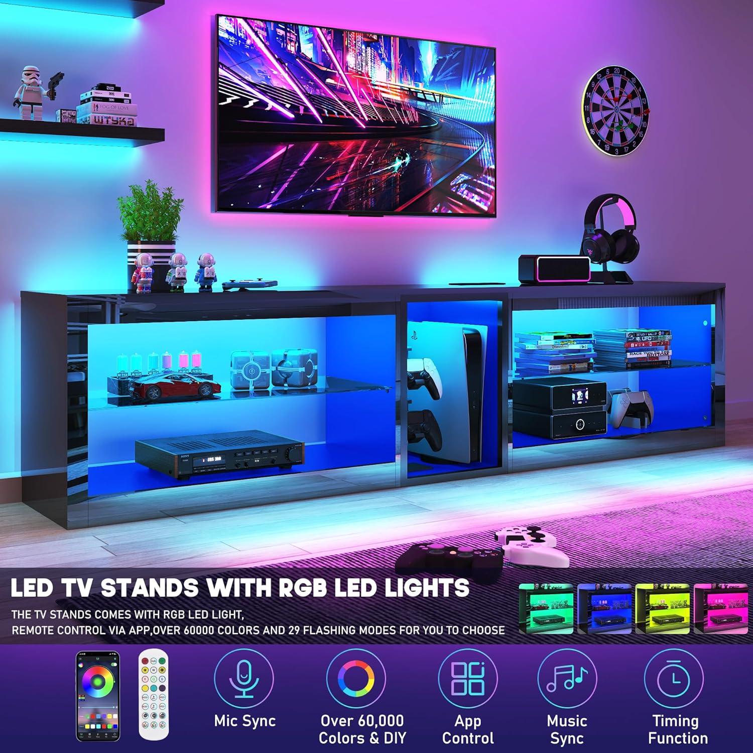 Additionally, the stand’s rounded corners provide an extra layer of safety, especially critically important in households with children, and the floating shelf design helps us keep the living room visually uncluttered. The storage capacity is notable for its size, easily accommodating gaming consoles, streaming devices, and decorative items. Below is a quick guide demonstrating how well it handles various TV sizes: