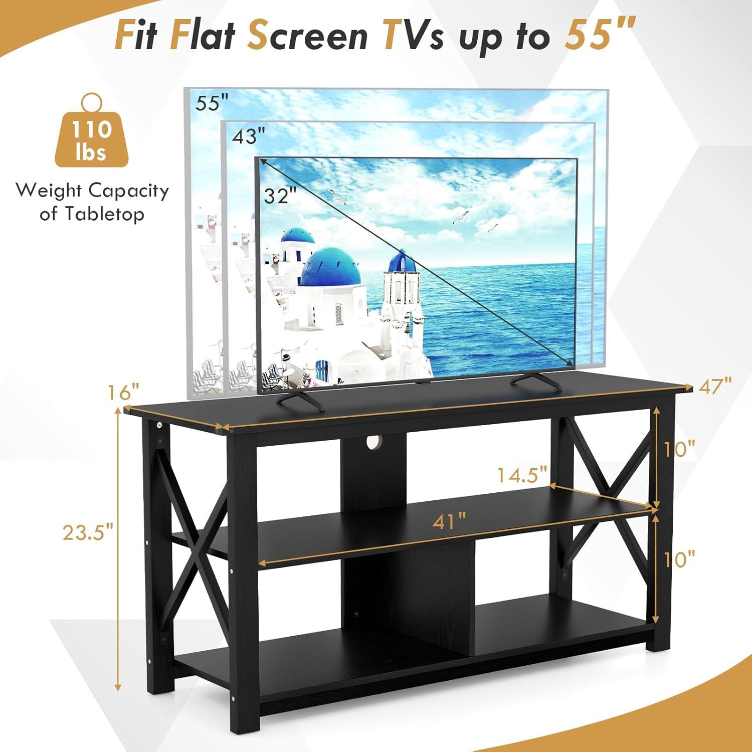 Built with durable engineered wood and reinforced by an eye-catching X-shaped metal frame, the shelves provide impressive sturdiness and support. Each shelf can comfortably hold up to 44 pounds, while the spacious tabletop supports TVs up to 55 inches and up to 110 pounds. Maintenance is simple thanks to the smooth, natural-textured surface that wipes clean effortlessly, ensuring this storage center stays as neat as the organized space it creates.