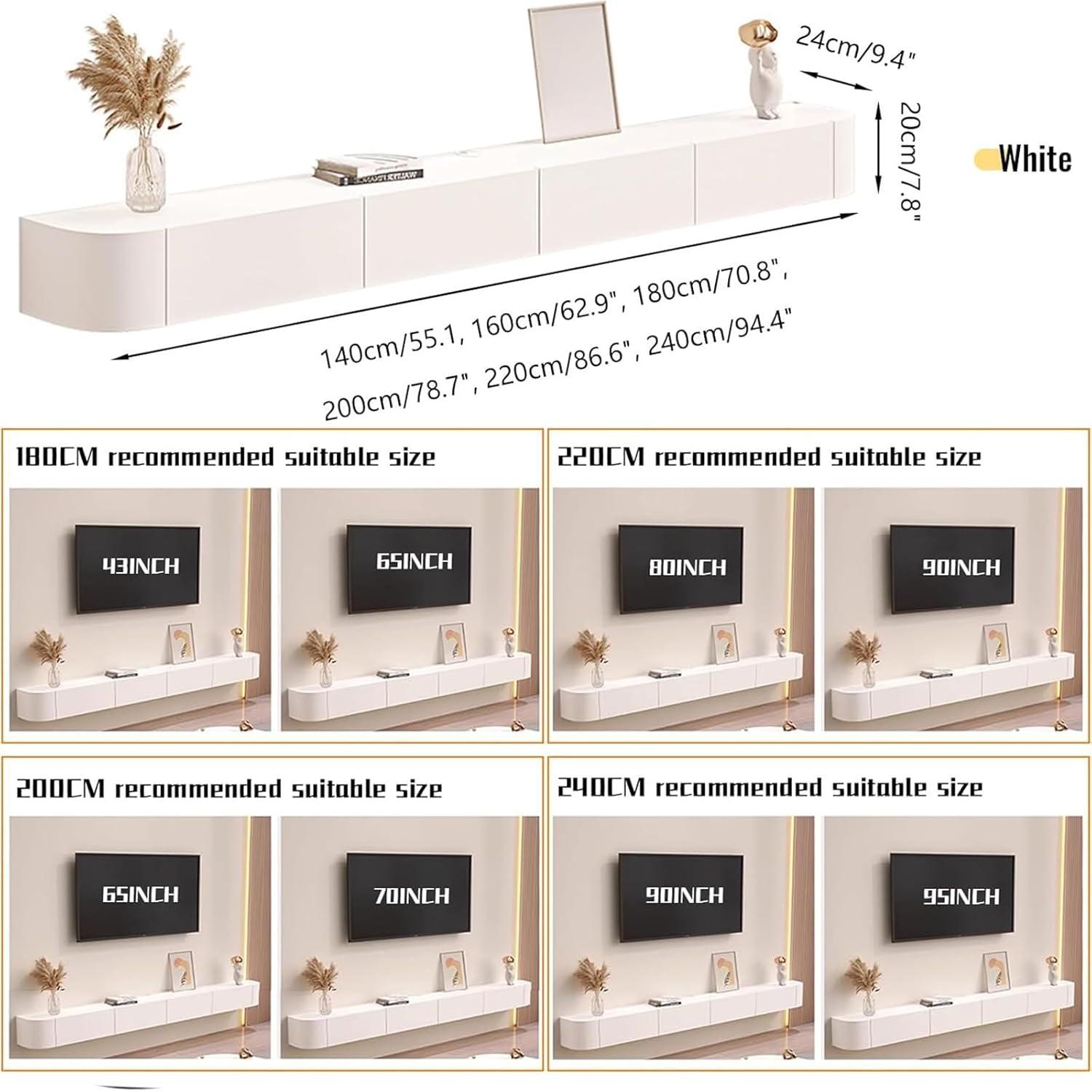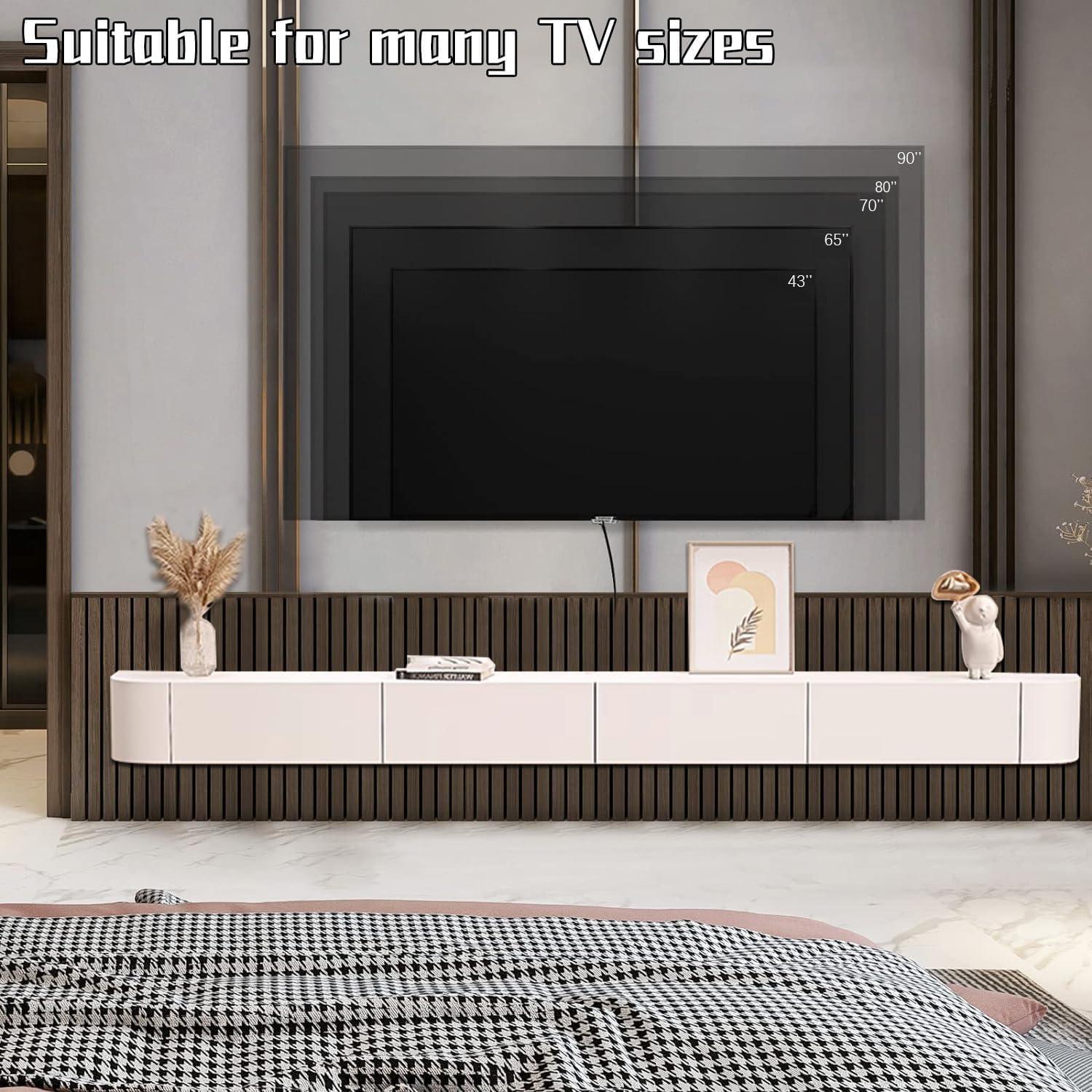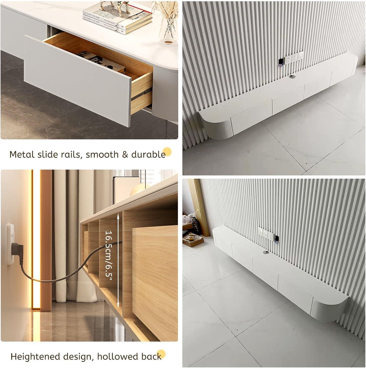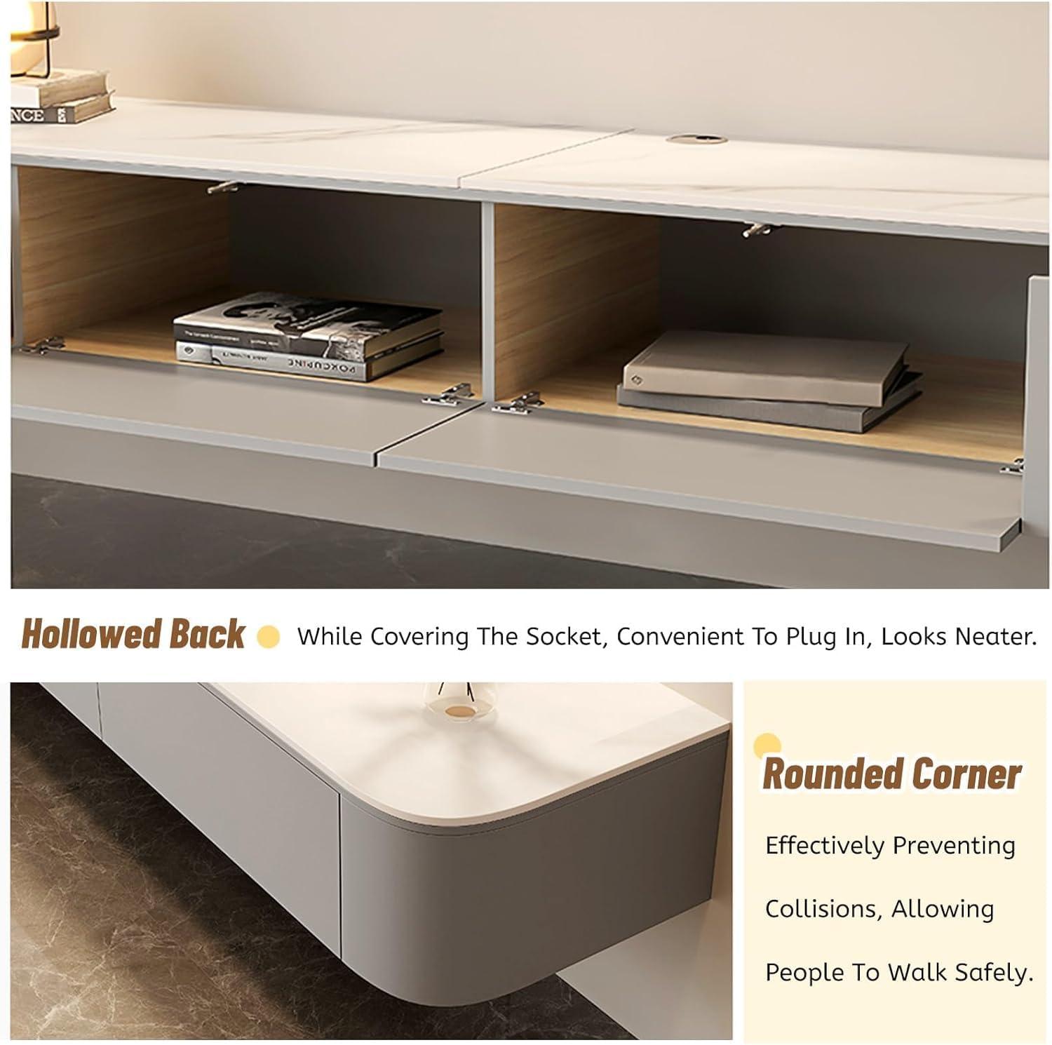 One of the standout aspects is its impressive storage capacity paired with clever organizational features. The floating design itself maximizes space by freeing up the floor area, which not only enhances the room’s openness but also allows cleaning tools such as sweeping robots to glide effortlessly underneath. The ample surface area, measuring 86.6 inches wide, offers a large platform to hold TVs of various sizes alongside multiple entertainment devices.Inside, the cabinet features compartments and shelves that organize everything from cable boxes and game consoles to DVDs and projectors, making clutter a thing of the past.