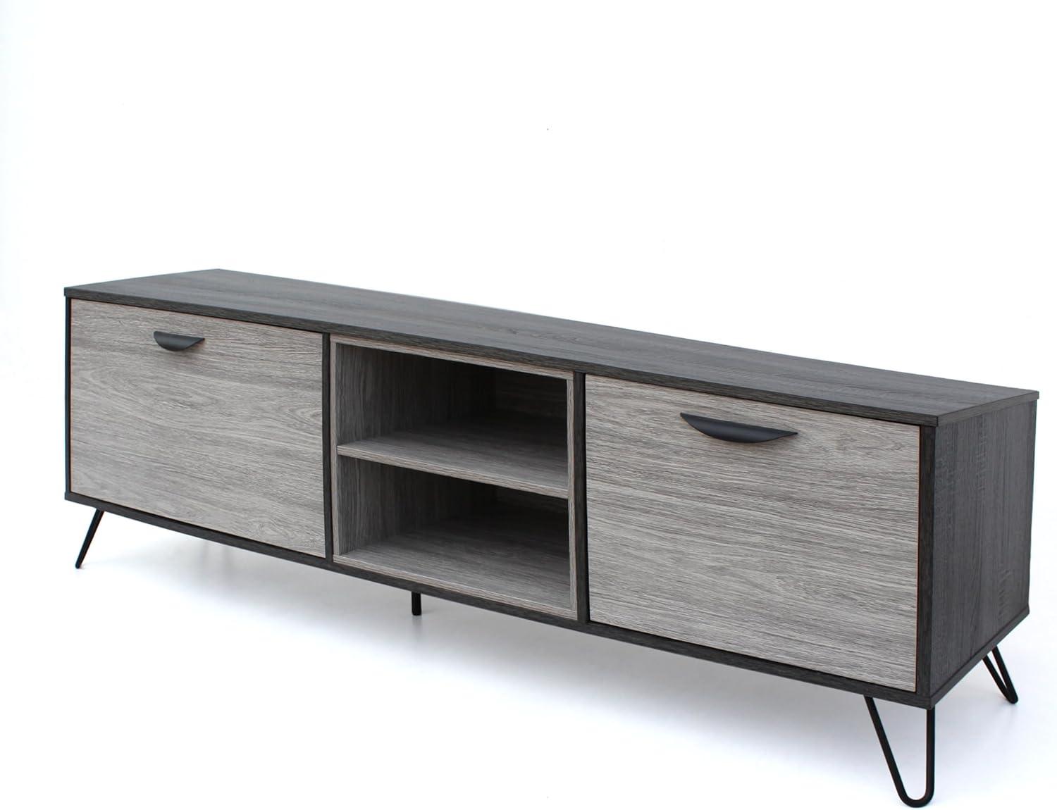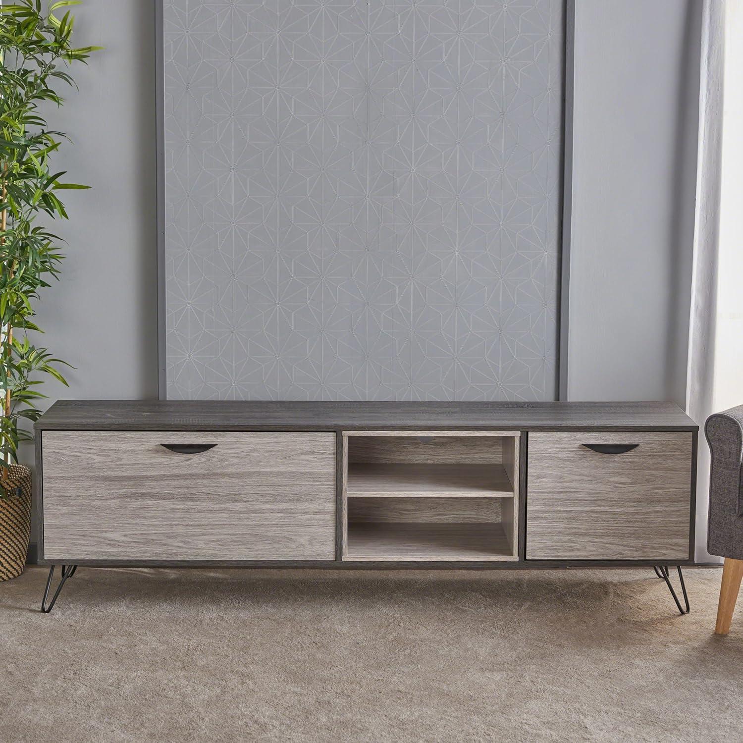 From the moment we unpacked this media console, its blend of mid-century modern and industrial styles caught our eye. The two-toned Sonoma Grey Oak finish contrasted beautifully with the sleek black hairpin legs, lending an understated elegance that feels both contemporary and timeless. Designed to hold TVs up to 79 inches, its dimensions make it a practical yet stylish centerpiece for a variety of living spaces, adding a refreshing upgrade without overpowering the room.