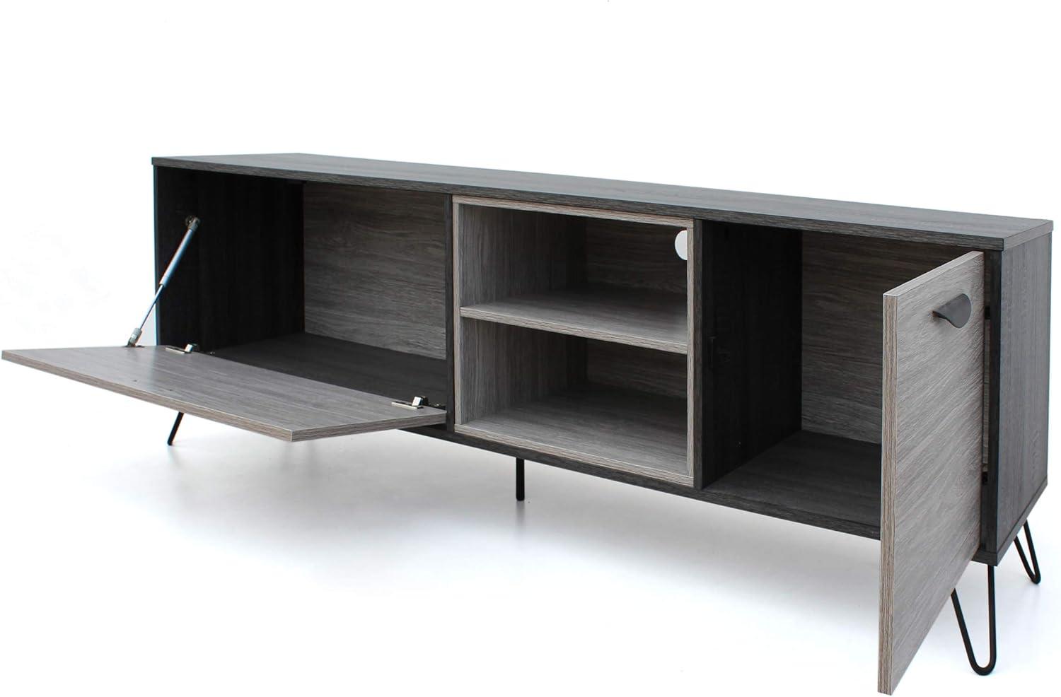 The combination of storage compartments made organizing our entertainment setup effortless. Plus, the sleek metal accents and hairpin legs create an industrial vibe that perfectly complements the wood grain finish-adding style without sacrificing functionality.