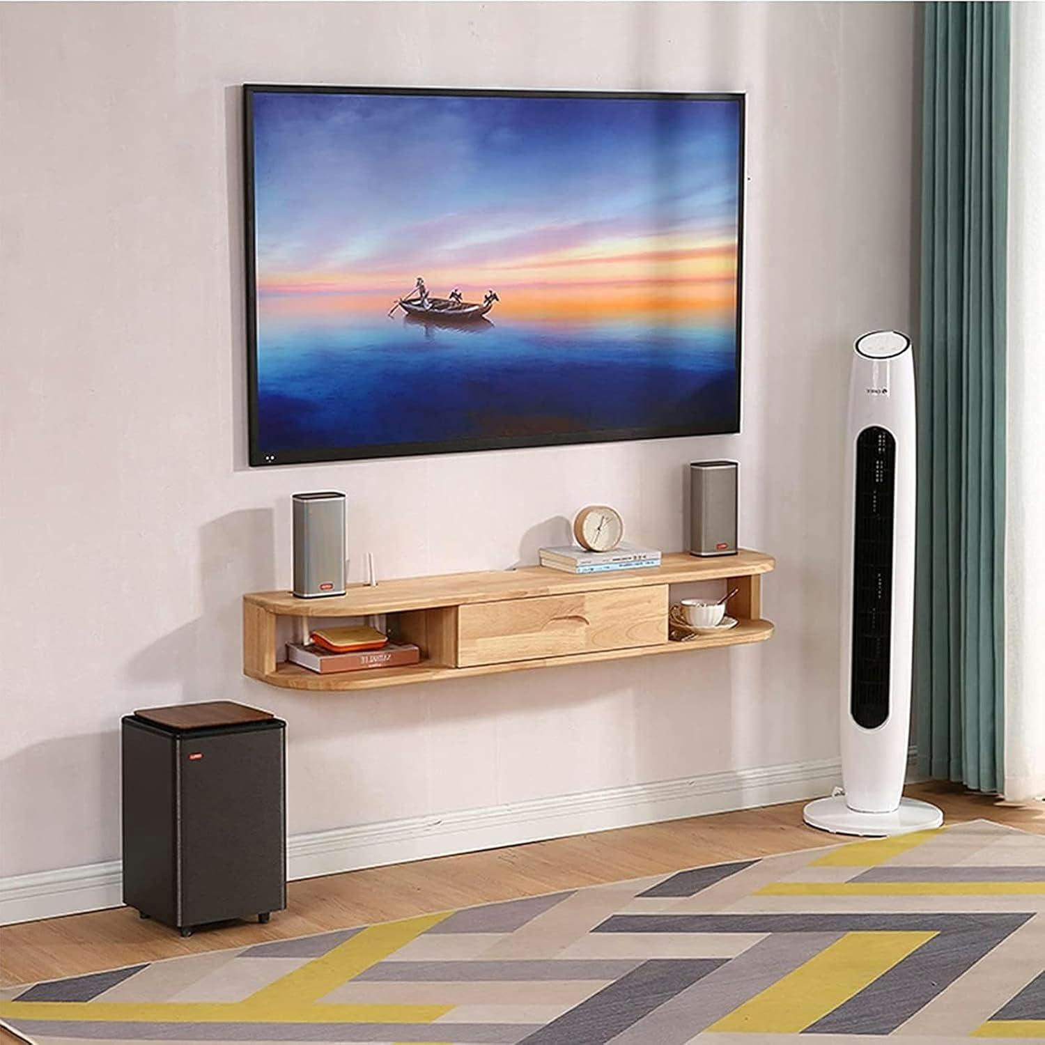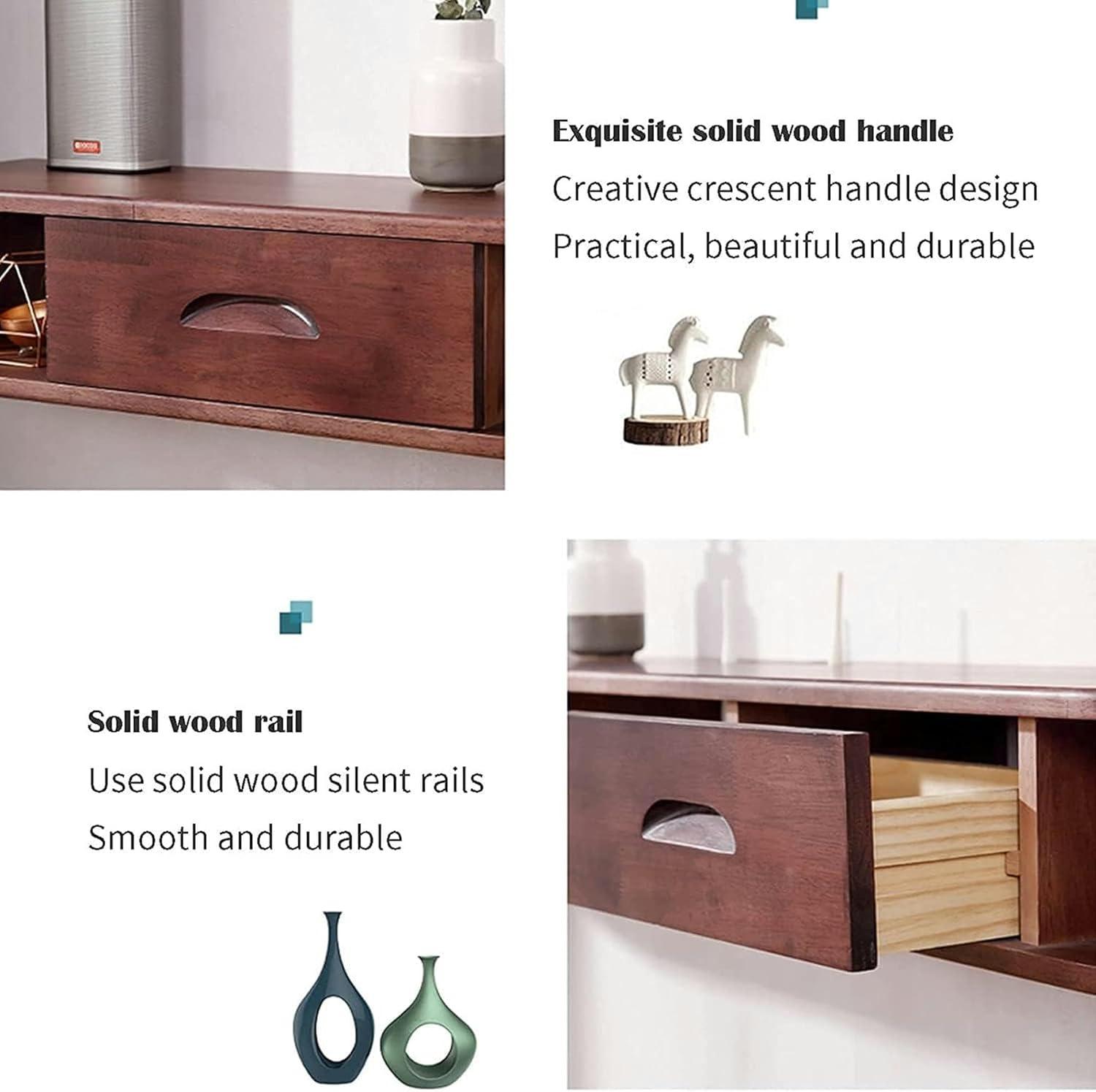 Integrating this floating console into our media entertainment area has truly transformed the space from bland to bold. The elegant design, crafted from high-quality solid rubber wood and finished with a glossy piano paint coating, not only adds a modern flair but also ensures durability.Its floating mount creates an illusion of spaciousness by freeing up floor space, making the entire setup look sleek and uncluttered. We’ve found it incredibly easy to clean and maintain, thanks to the waterproof and dustproof surface, which keeps our media center looking brand new despite heavy daily use.