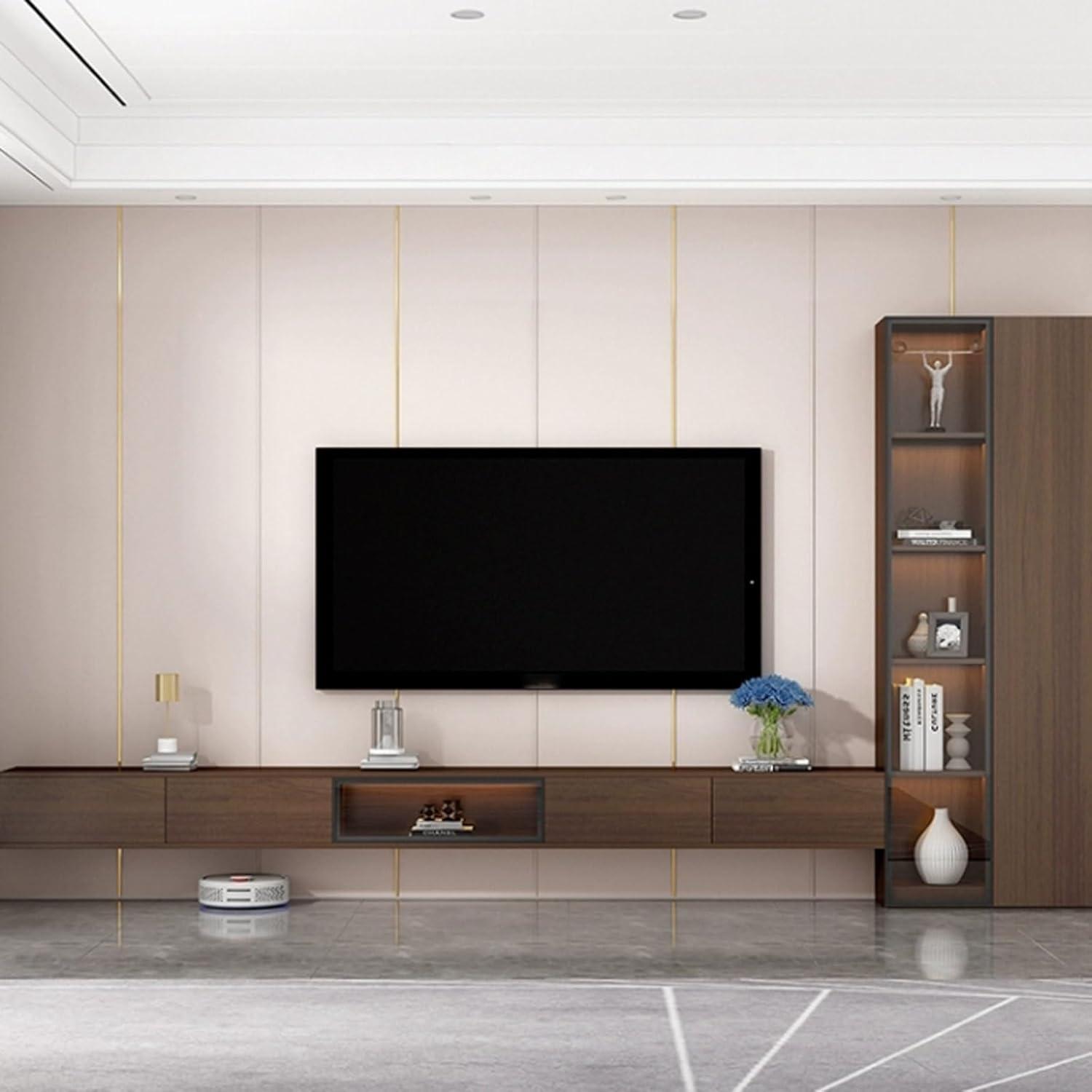 One of the standout features of this floating TV stand is its notable ability to maximize storage without sacrificing style or space. The wall-mounted design cleverly frees up floor area, making our rooms feel more open and less cluttered.The spacious cabinet underneath the TV is perfect for organizing a variety of media essentials such as cable boxes, game consoles, DVDs, and even our treasured collectibles or photo frames. Its generous size ensures that everything stays within easy reach, turning clutter into a neatly arranged display. Additionally, the smooth, durable wood finish not only adds a warm, modern aesthetic but also resists abrasion and water spills, making maintenance effortless.