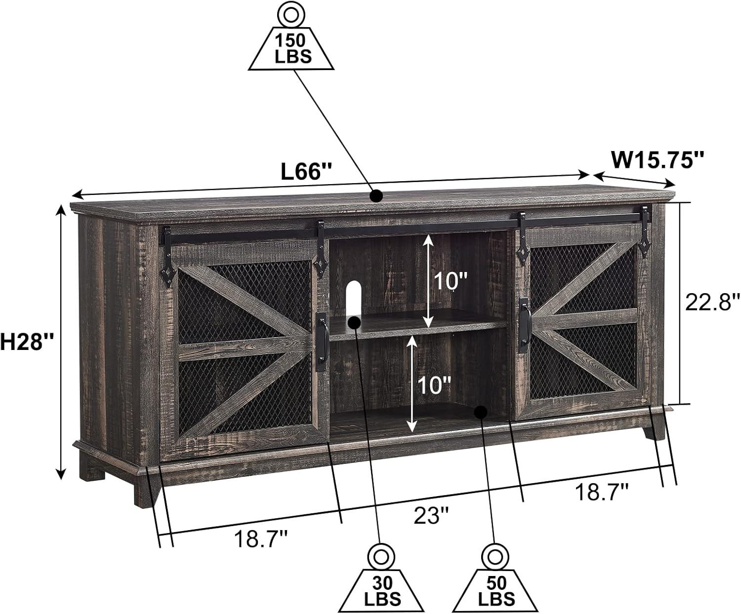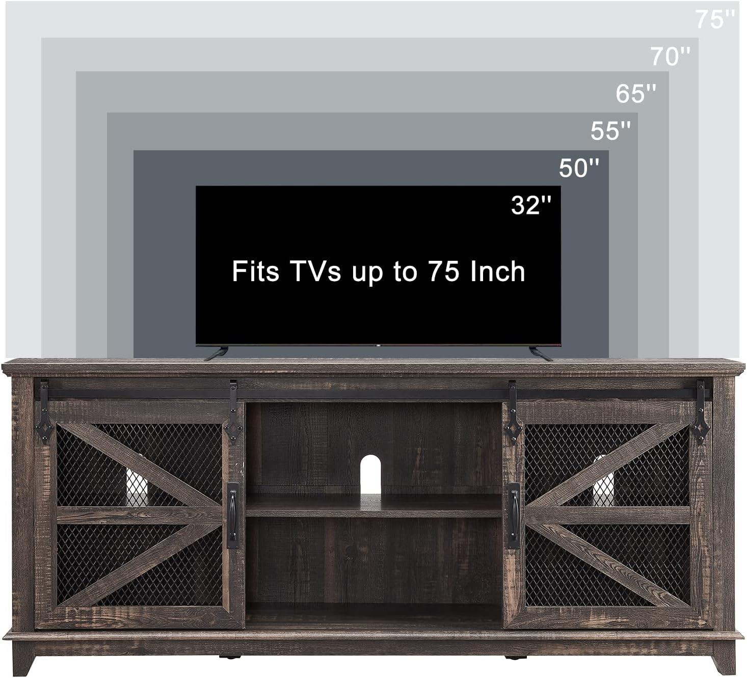 We appreciate how this piece perfectly merges industrial aesthetics with farmhouse charm,boasting a dark rustic oak finish that imbues any living space with warmth and character. The standout sliding barn doors, accented with inset metal mesh and dark iron-tone hardware, not only add a distinctive design element but also offer versatile functionality. Its dimensions are thoughtfully crafted to accommodate TVs up to 75 inches, while maintaining a sleek profile that suits various room layouts.