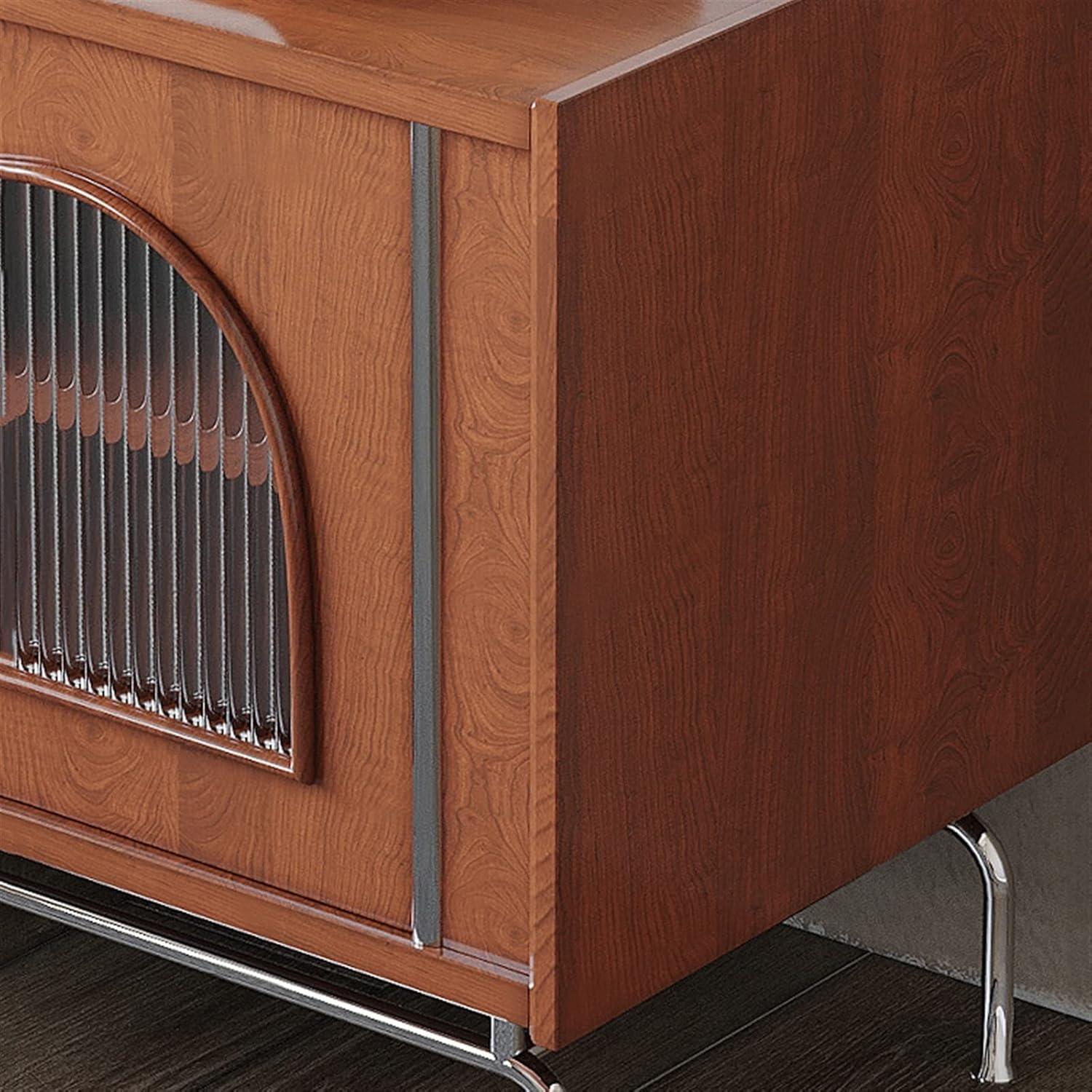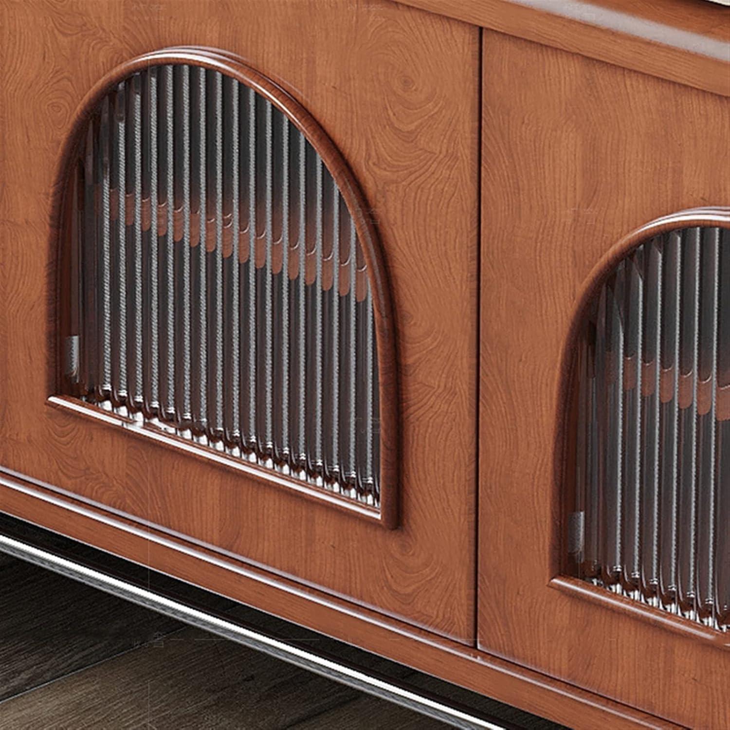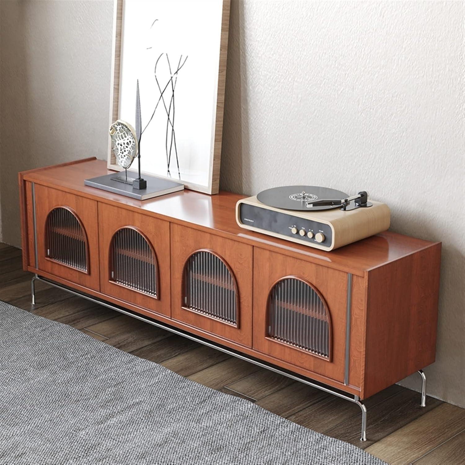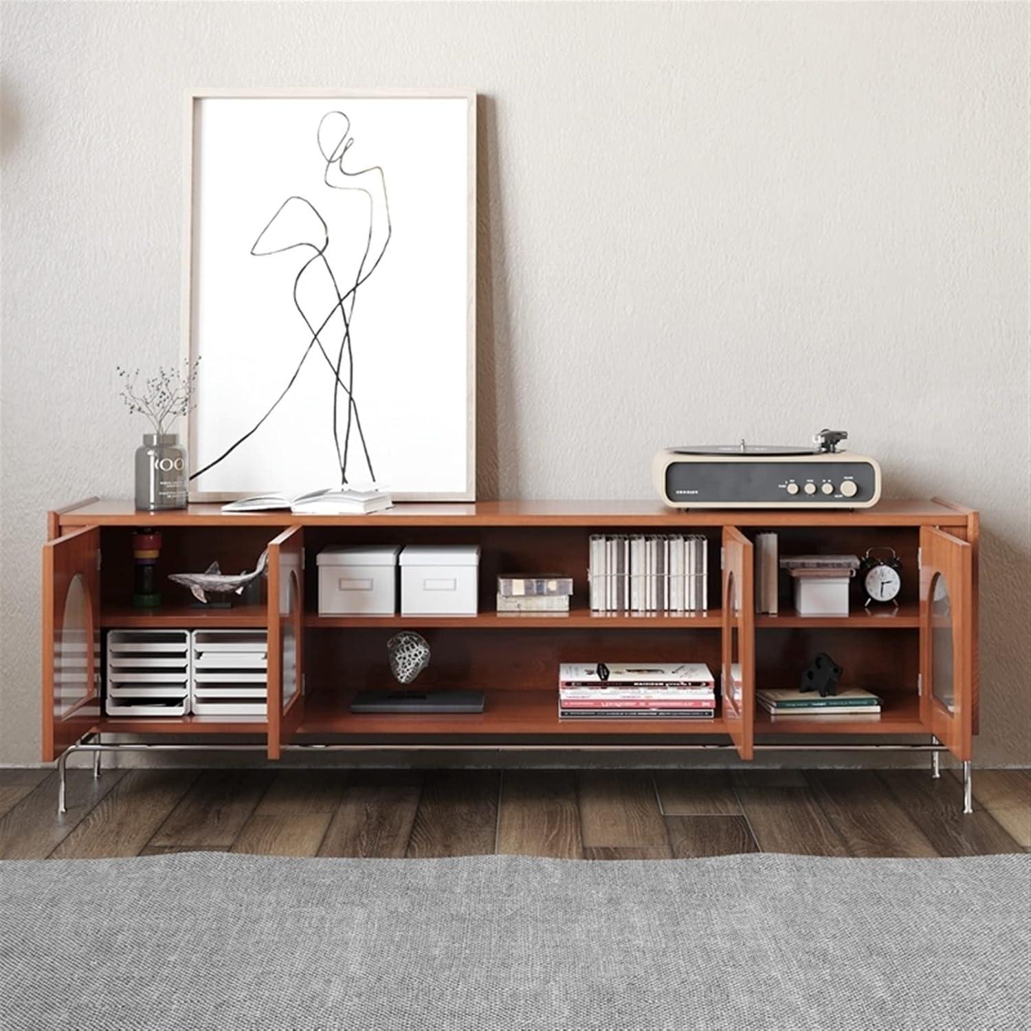 We found this entertainment center to be a perfect blend of modern farmhouse charm and functional design. Crafted from rich cherry wood,accented by high-quality Changhong glass,and supported by sleek stainless steel legs,it brings a fresh yet timeless look to any room. The arched glass doors with an innovative pop-up mechanism add a touch of elegance and convenience, making it simple to access storage without traditional handles. With four cabinet doors and spacious shelves inside each, the unit offers ample space to tuck away media devices, books, or living room essentials while maintaining a clean, uncluttered appearance.