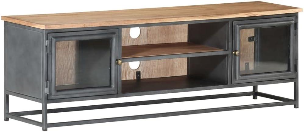 Combining solid acacia wood with a sleek steel frame, this TV stand strikes a perfect balance between durability and modern elegance. The grey matte finish adds a subtle sophistication that blends effortlessly with various interior styles-from industrial lofts to rustic farmhouses. Its thoughtfully designed structure includes two glass doors that not only display your favourite décor and media components but also protect them from dust,maintaining a clean and polished look.Measuring just over 51 inches in length and featuring a 4.7-inch leg height, it adds a subtle floating effect that elevates the room’s ambiance without overwhelming your space.