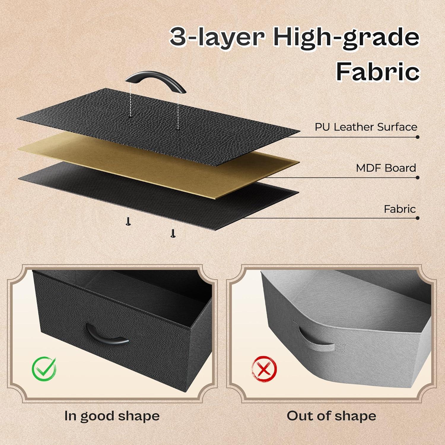 Fabric drawers and hardware have a softer, more provisional character. The drawers themselves are made from non‑rigid woven material with stitched seams and a reinforced front panel; when empty they collapse a bit, and when filled they hold their shape around a thin rigid insert in the base. Drawer movement is guided by simple plastic runners rather than metal glides,so pulls and returns are quiet and slightly forgiving — you’ll often give a drawer a little nudge to seat it fully. The visible fasteners and connectors in the kit are standard hex bolts, cam locks and short wood screws; most thread in without drama but you might re‑check a connection after a few weeks of settling. A quick list of the main hardware elements you’ll handle during setup: