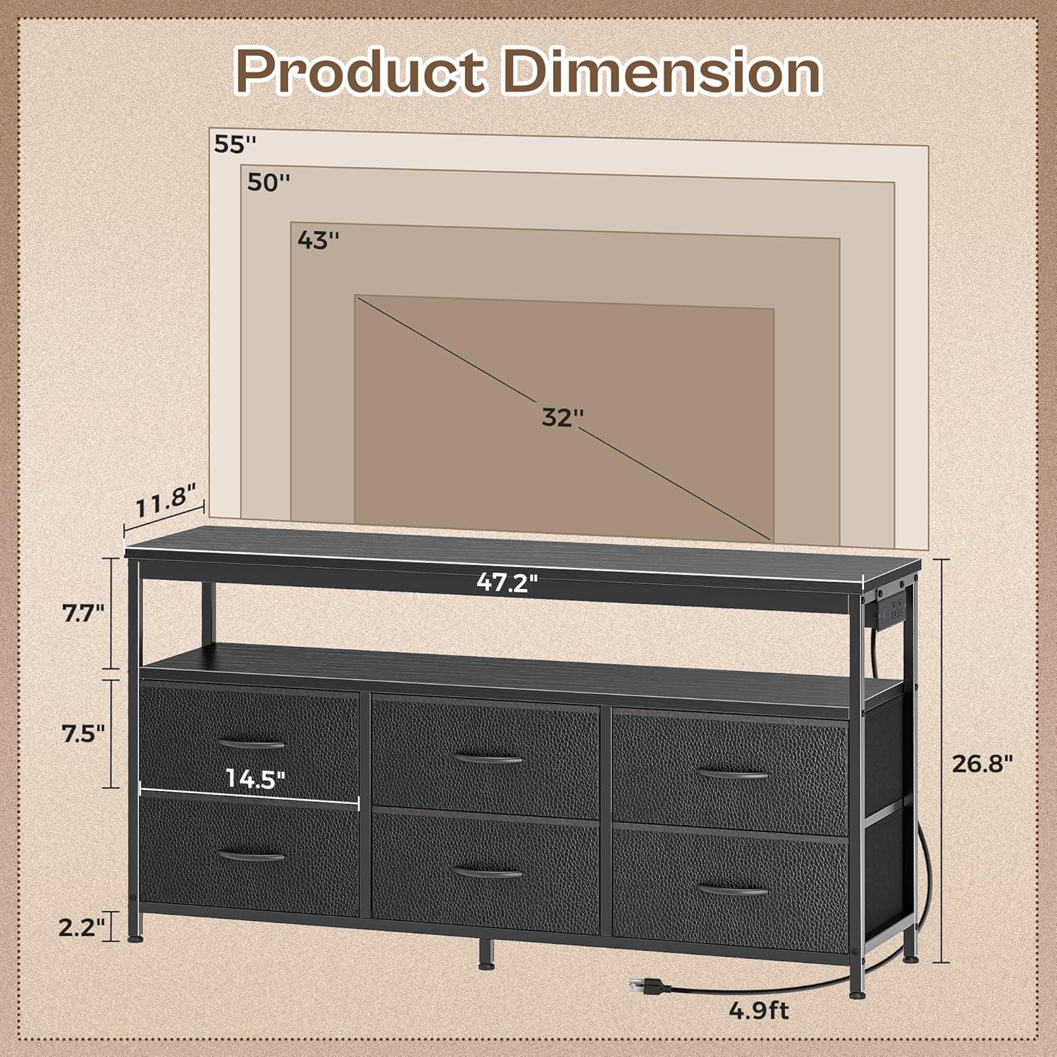 When a 43–55 inch TV is placed on the dresser it usually sits with most of the screen comfortably centered on the top surface, leaving a modest margin at either side on typical installations. Smaller 43-inch sets tend to leave a visibly wider border of tabletop for a lamp or small items, while 55-inch panels can come closer to the edges, especially when their feet are set wide. tvs with dual, outboard feet will extend the usable footprint toward the dresser corners, whereas a single central pedestal concentrates weight in the middle and can reduce usable surface on either side of the base. Cabling and the option to place the built-in power outlets to the left or right sometimes lead to slight lateral adjustments of the set, and it’s common to nudge the screen back a couple of inches to keep connectors and vents unobstructed.