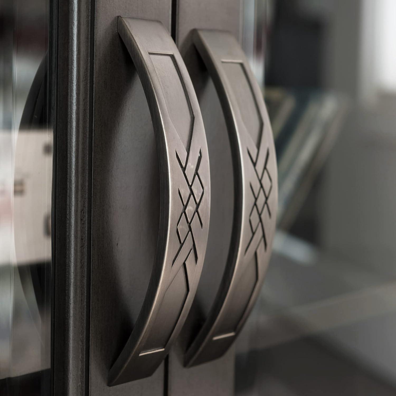 - glass and metal: clear tempered glass with subtle green edge; pewter pulls with a brushed texture