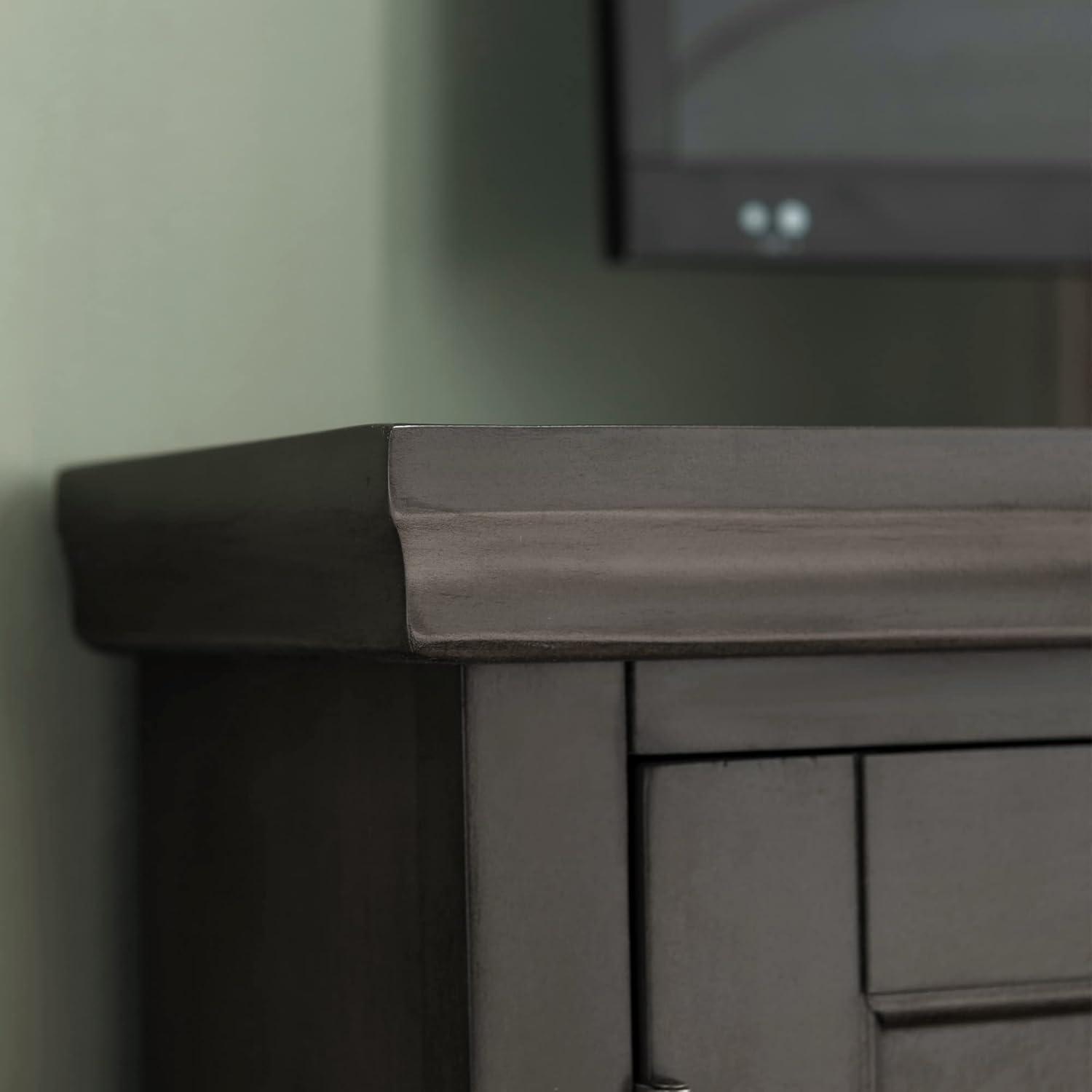 Up close, the Riverstone Gray reads as a soft, mid-tone gray with faint woodgrain that is more visible at certain angles. Under natural light you may notice subtle warm undertones; under cooler artificial light the color can lean slightly bluer. the finish is closer to satin than gloss—smooth to the touch but not slick—so fingerprints show less boldly than on glass but small dust and smudges become apparent over time. When you pass a fingertip along the cabinet faces, the veneer’s texture is perceptible in places and the finish wraps around the edges with a narrow seam where panels meet; those joints sometiems display a small color shift or a tight line where veneer meets solid edging. The tempered glass doors are clear with the usual faint green edge and pick up occasional streaks, while the pewter hardware has a muted, brushed look that shows tiny machining marks if you bring it very close.