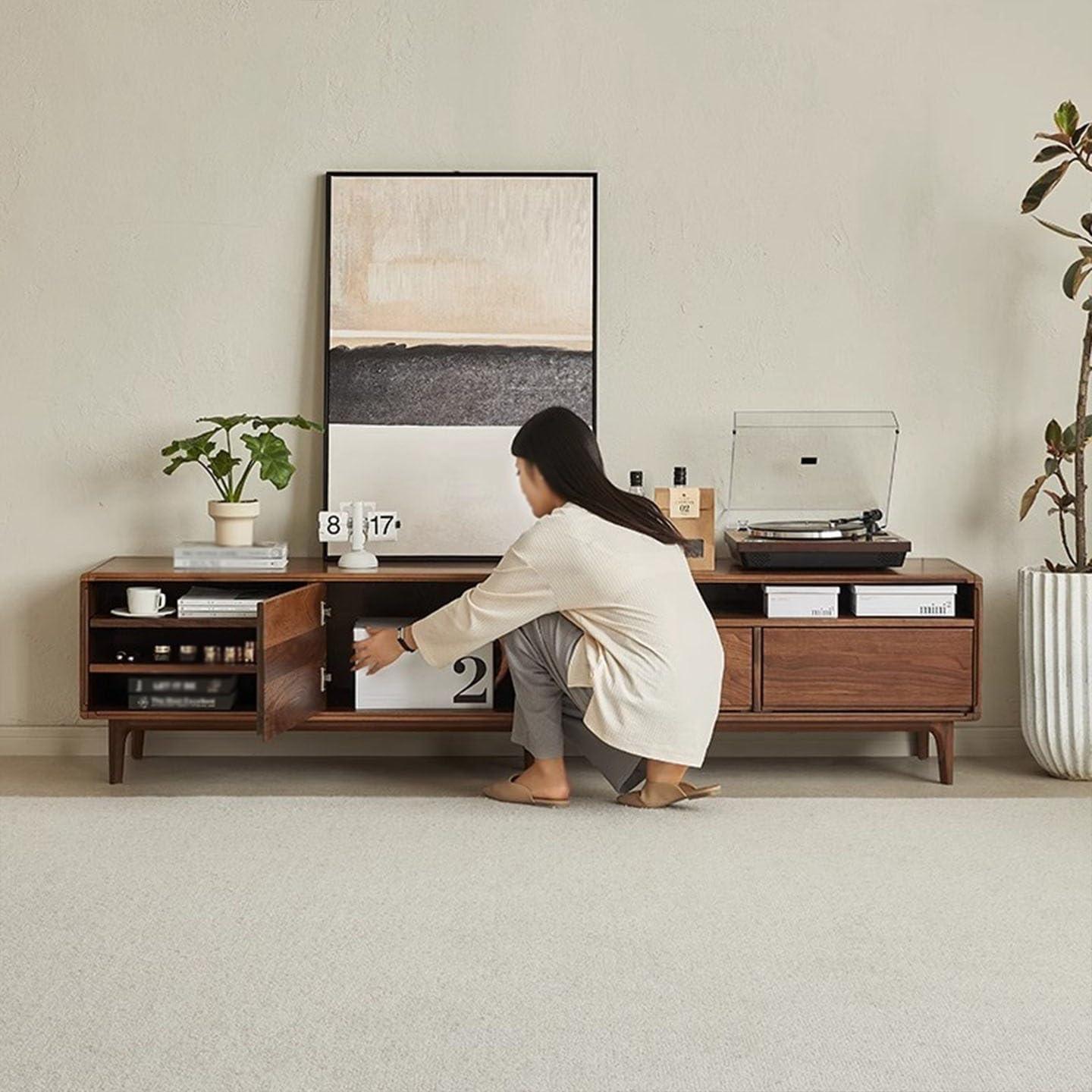 When you first step into the room and your eyes meet the cabinet, it reads as a horizontal anchor that draws sightlines across the wall. The surface catches whatever light is in the room and shifts subtly as you move—warmer in the morning, a touch deeper under evening lamps—so your impression can change over the course of a day.You’ll likely find yourself adjusting small things instinctively: a magazine tilted so the title faces you, a coaster placed where your hand naturally rests, the remote moved an inch closer to the sofa. Up close, edges and joins register as small details rather than abstractions; from a little distance thay simply give the piece a steady presence that organizes the visual field without calling attention to itself.